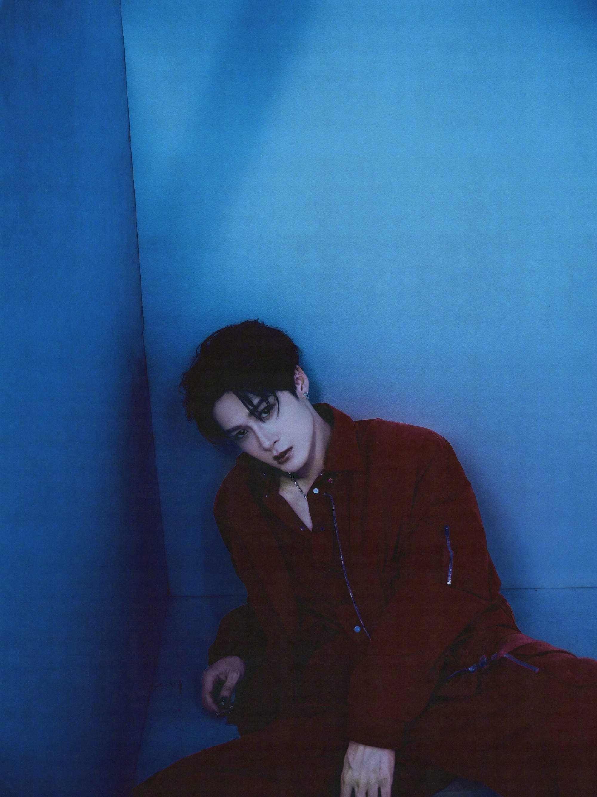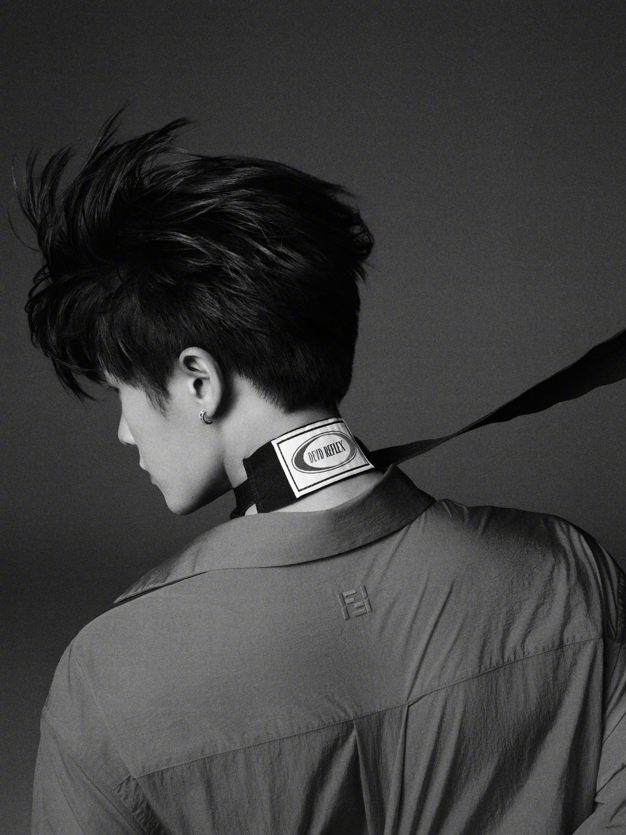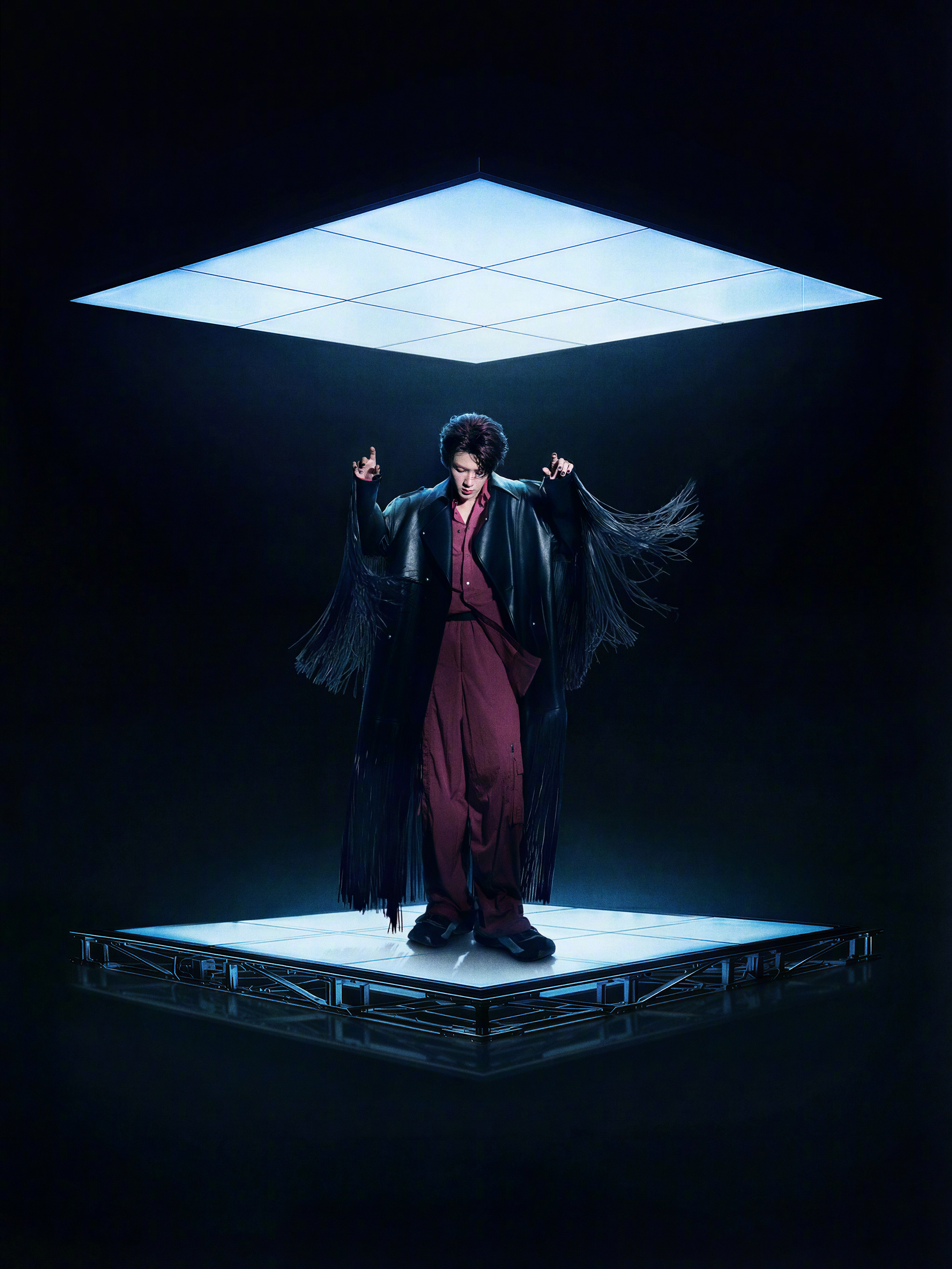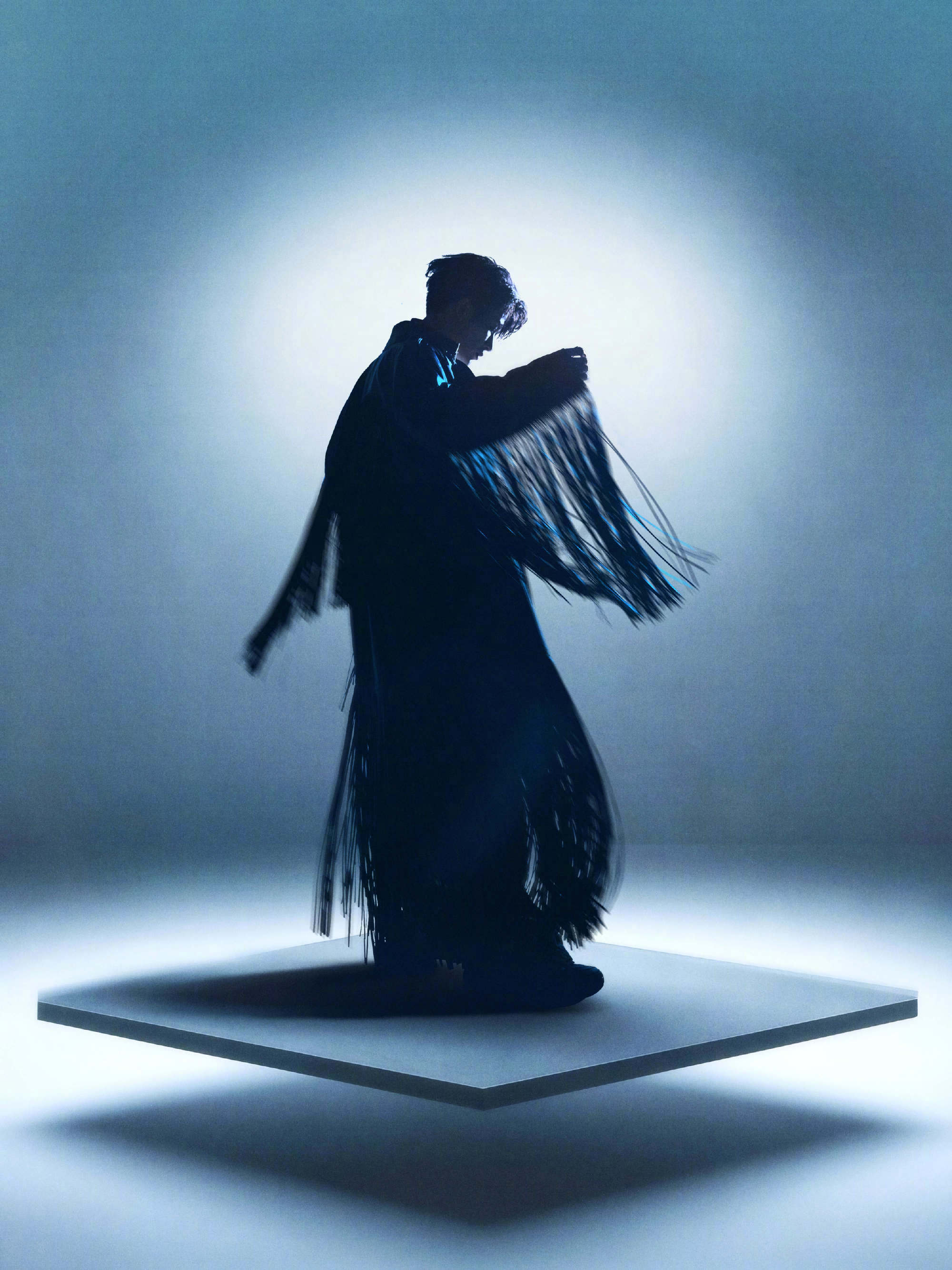 檀健次 今晚 造型图,穿着Fendi套装和皮革流苏大衣,佩戴DeBeers高级珠宝,冷调蓝光交错,酷帅的未来主义画风,关于「我」的时髦表达。💙❤️🖤
