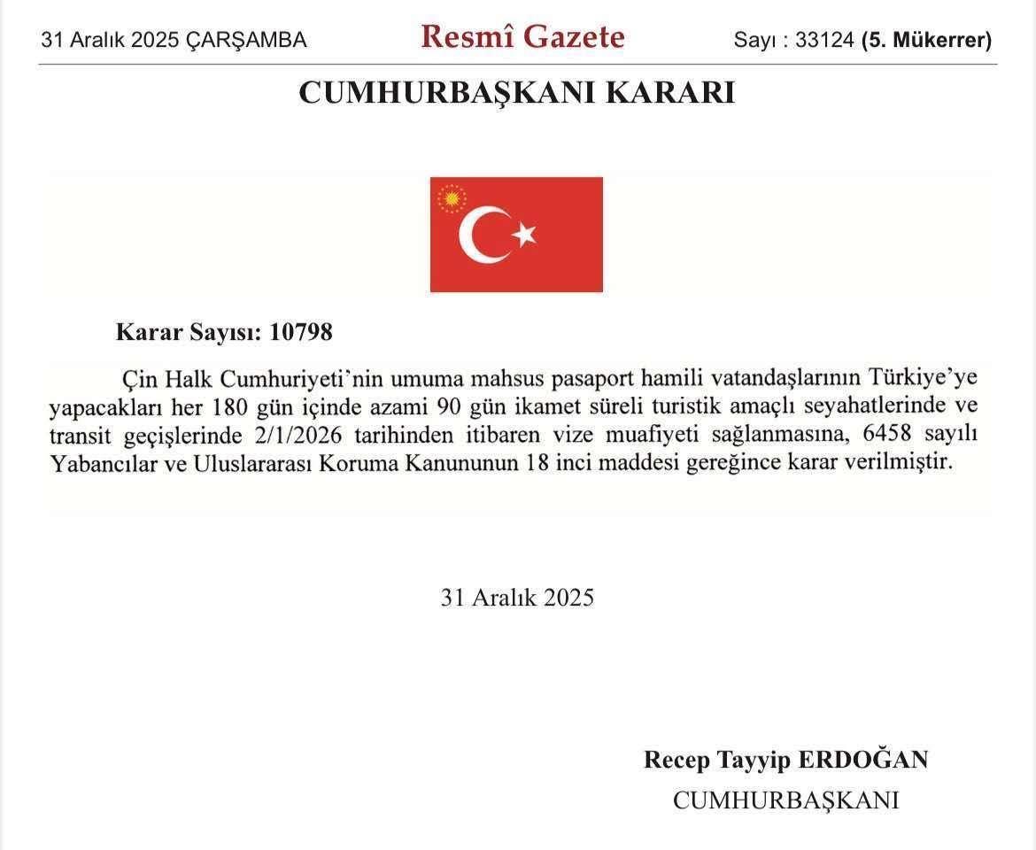 12月31日,土耳其《官方公报》发布总统令,明确自2026年1月2日起,对持中国普通护照的公民实施免签入境政策。 根据政策要求,以旅游、过境为目的的中国公民,每180天内可享受累计不超过90天的免签停留待遇。