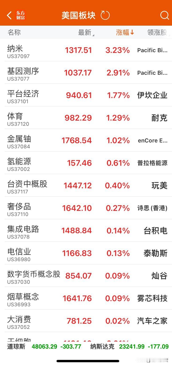 美市场及龙指数均收中阴(元旦) 大A休市,目前无任何影响! 美三大指数均高开低走,收阴。 板块层面,美股多数板块走弱,空壳公司板块跌幅最大,达4.79%,固态电池、激光雷达概念板块跌幅也超2%;腾讯概念、小米概念、固态硬盘等板块跌幅在1.5%-2%区间,金融概念、制造业、商业航天等数十个板块跌幅集中在1%左右。仅少数板块飘红,纳米板块涨幅3.23%居首,基因测序板块涨幅2.91%次之,平台经济、体育等板块虽有上涨,但涨幅普遍低于2%,整体市场呈现跌多涨少的格局,中概股相关板块也未能幸免,中概回港概念股下跌1.54%,中概股整体板块下跌0.93%。 大A跨年主线:商业航天,其余相对主线:人工智能、新能源车、军工