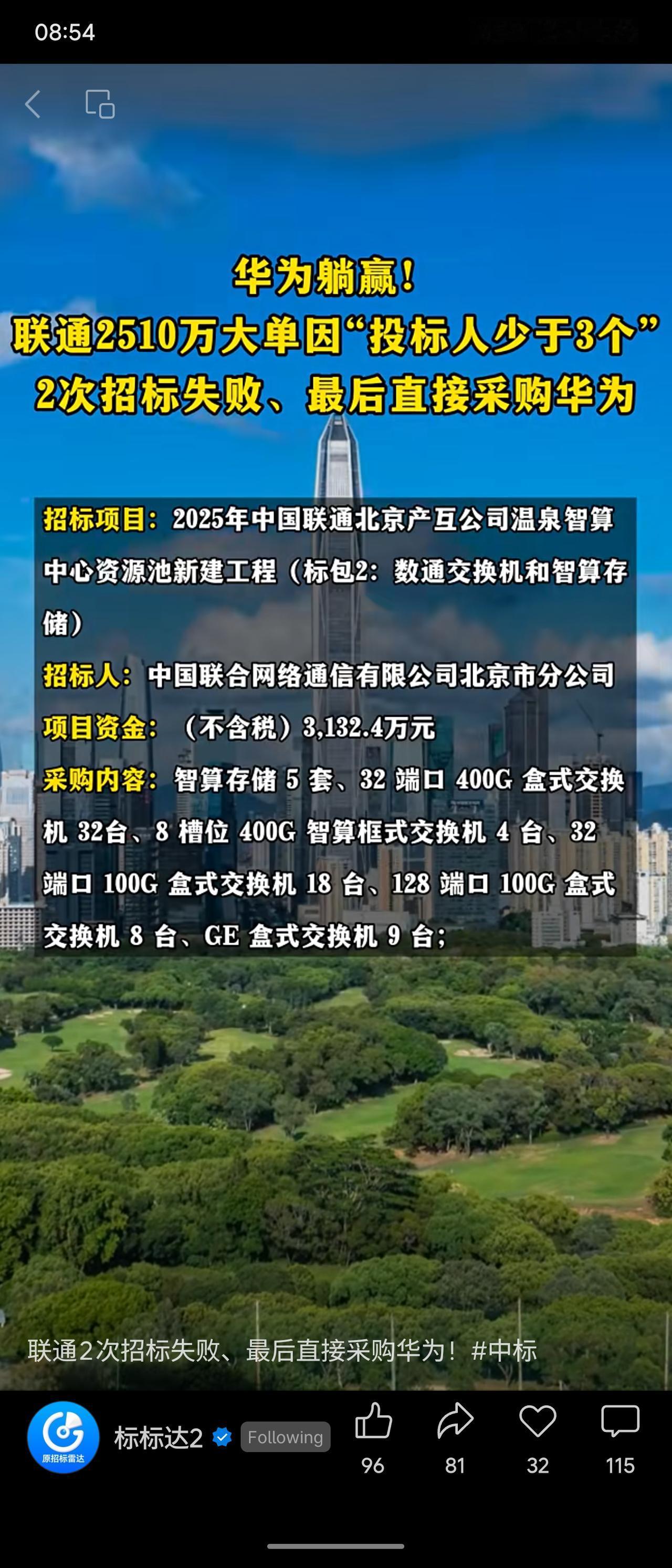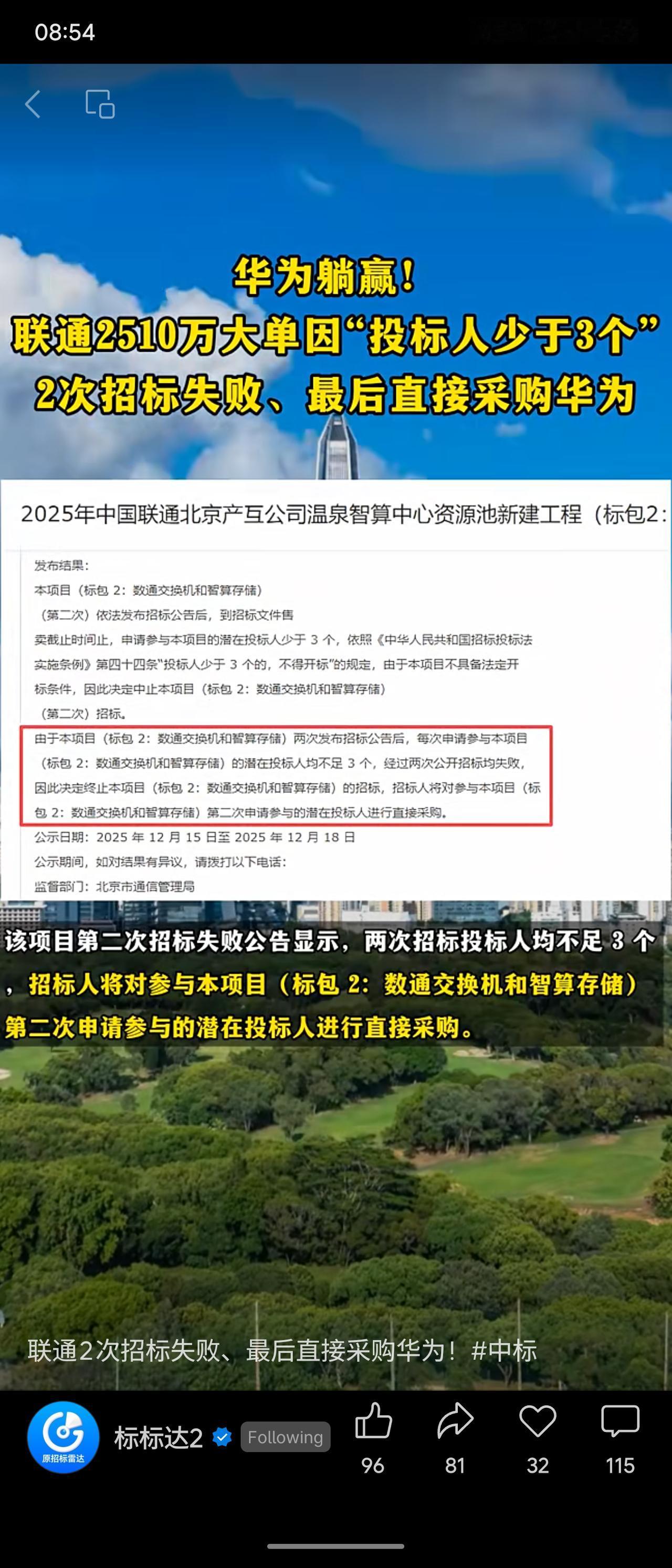 中国联通北京产互公司智算中心项目两次公开招标均因投标人不足3家而失败,最终依法转为直接采购。华为作为唯一参与的供应商,获得价值约2510万元的数通交换与智算存储设备订单。