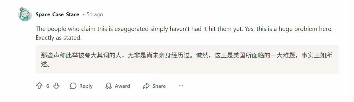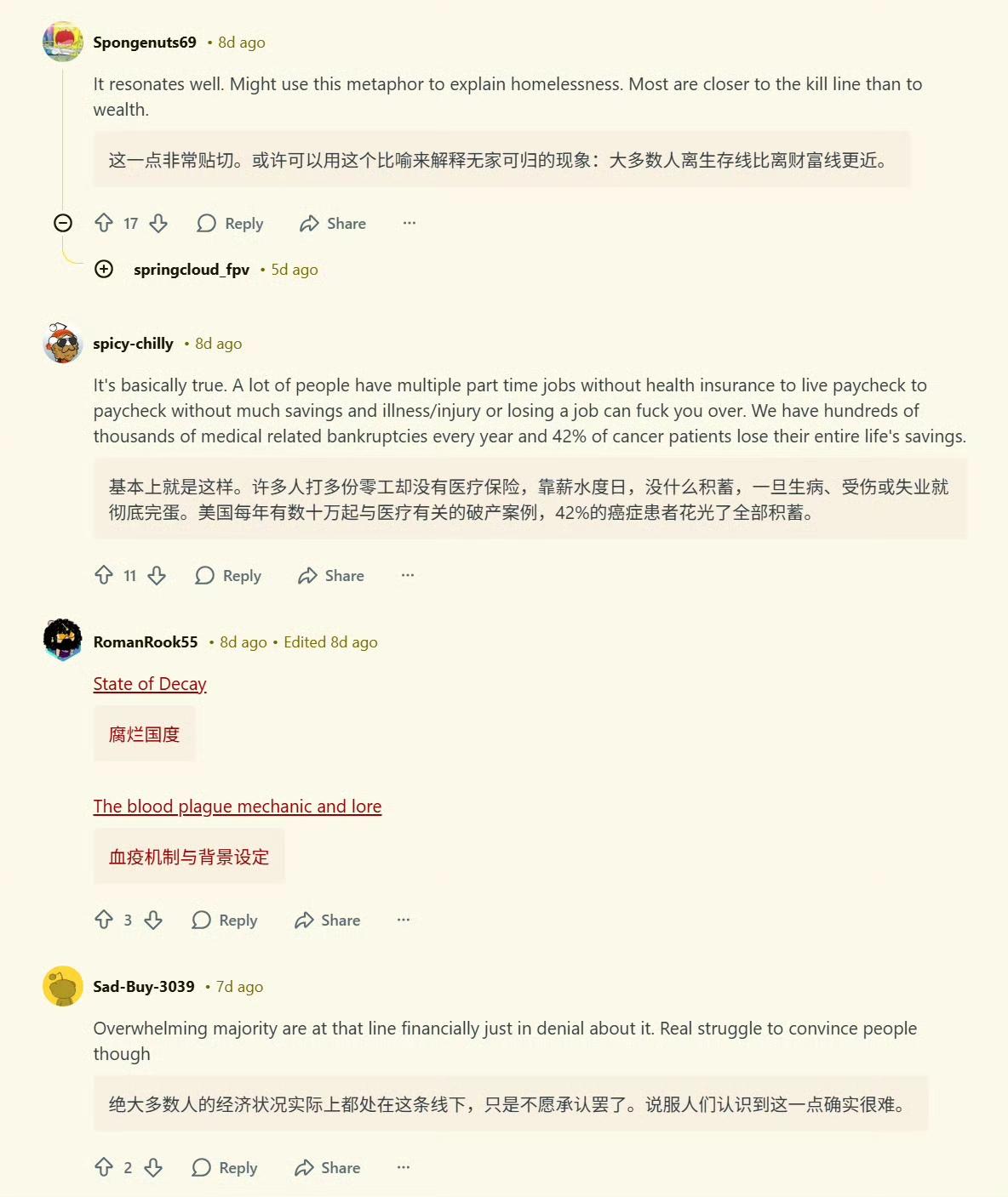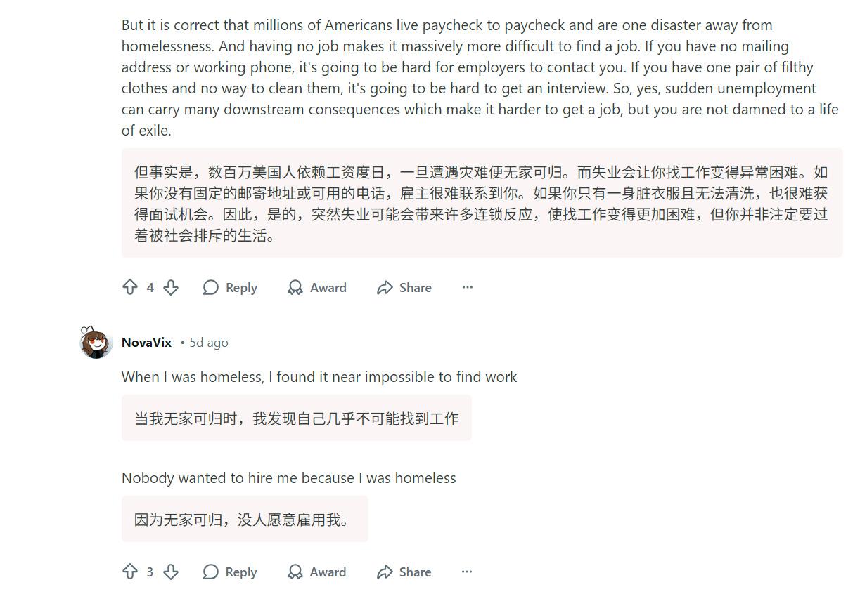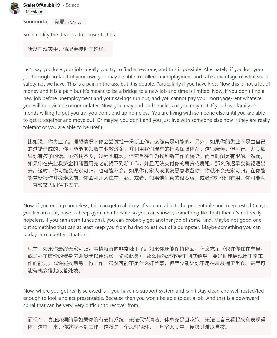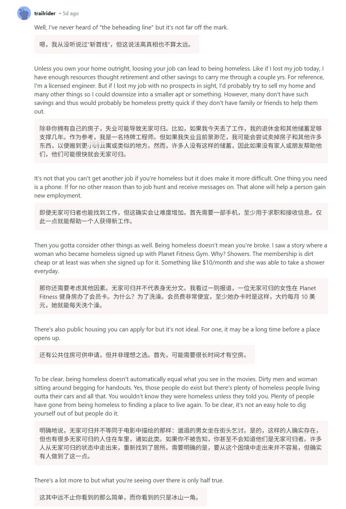美国人坚定的认为,美国有斩杀线(生死线、生存线)。 “这一说非常贴切。或许可以用这个比喻来解释无家可归的现象:大多数人离生存线比离财富线更近。” “绝大多数人的经济状况实际上都处在这条线下,只是不愿承认罢了。说服人们认识到这一点确实很难。” “这比喻真TM绝了,我太喜欢了。” 一些假美国人需要的不是一个真实客观的美国,而是令人景仰的“地上神国——美国”。 有的人开始在发小作文给斩杀线洗地,说牢A造谣,反对斩杀线一说。 美国的这个制度太狠了,一环扣一环。绝大多数人如果没有什么基础,也没有家庭支持的话,在美国应该待不下去了。 而如果在G内,至少有住处(大不了回农村种地),有车的可以开网约车,无车的可以买一个电动自行车送外卖。实在连踏板车也不愿意买,就可以学三和大神,用日租电动车去跑外卖,赚了几百元又可以躺好几天。 全球网友在看热闹,美国网友表示坚决承认,只有那个群体在急!好难猜哦。 一个甜甜圈顶一个S,彻底粉碎了一部分人对美国美好生活的幻境。一个牢A顶十个S,连美国本土的美国人都受到深刻影响:由高傲转为自卑。