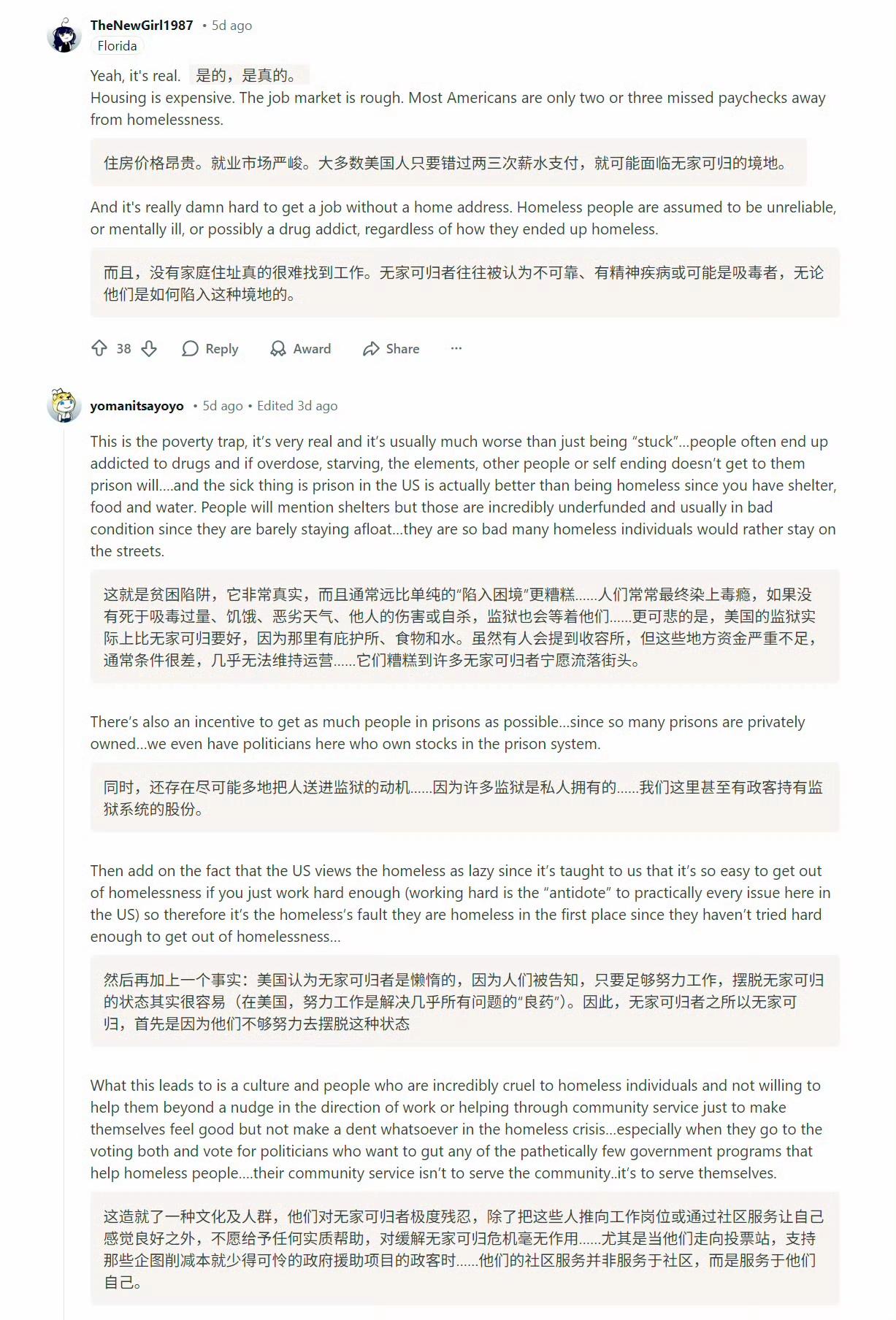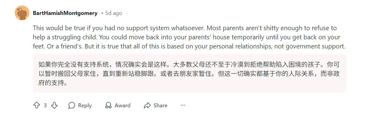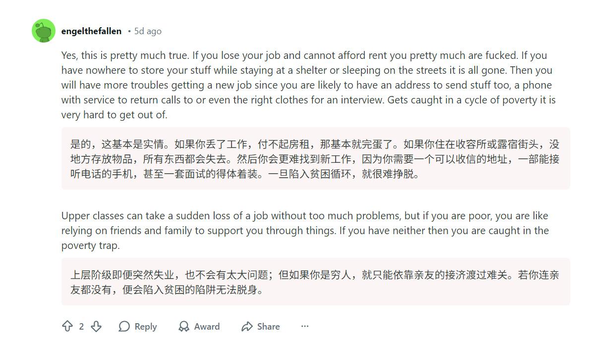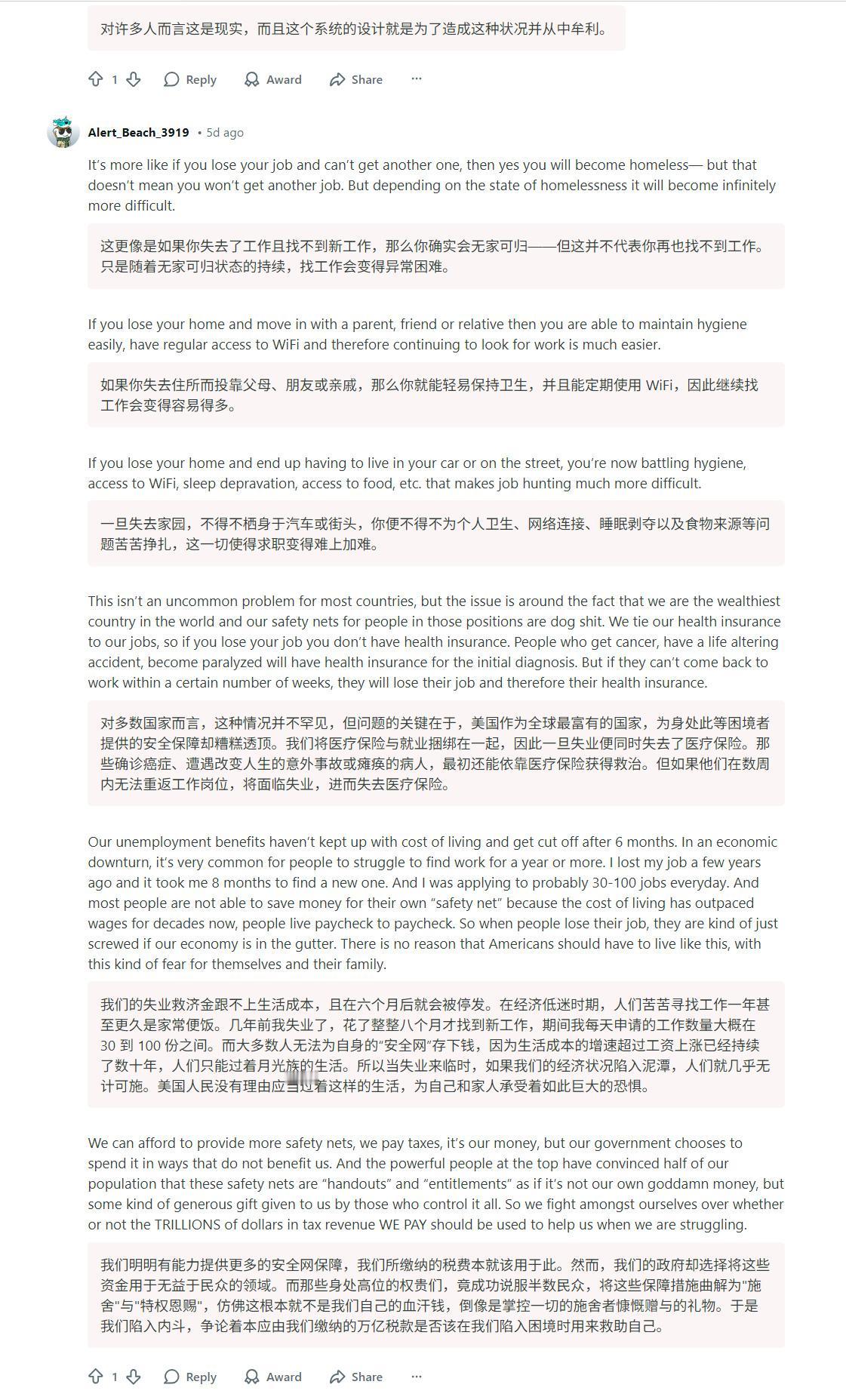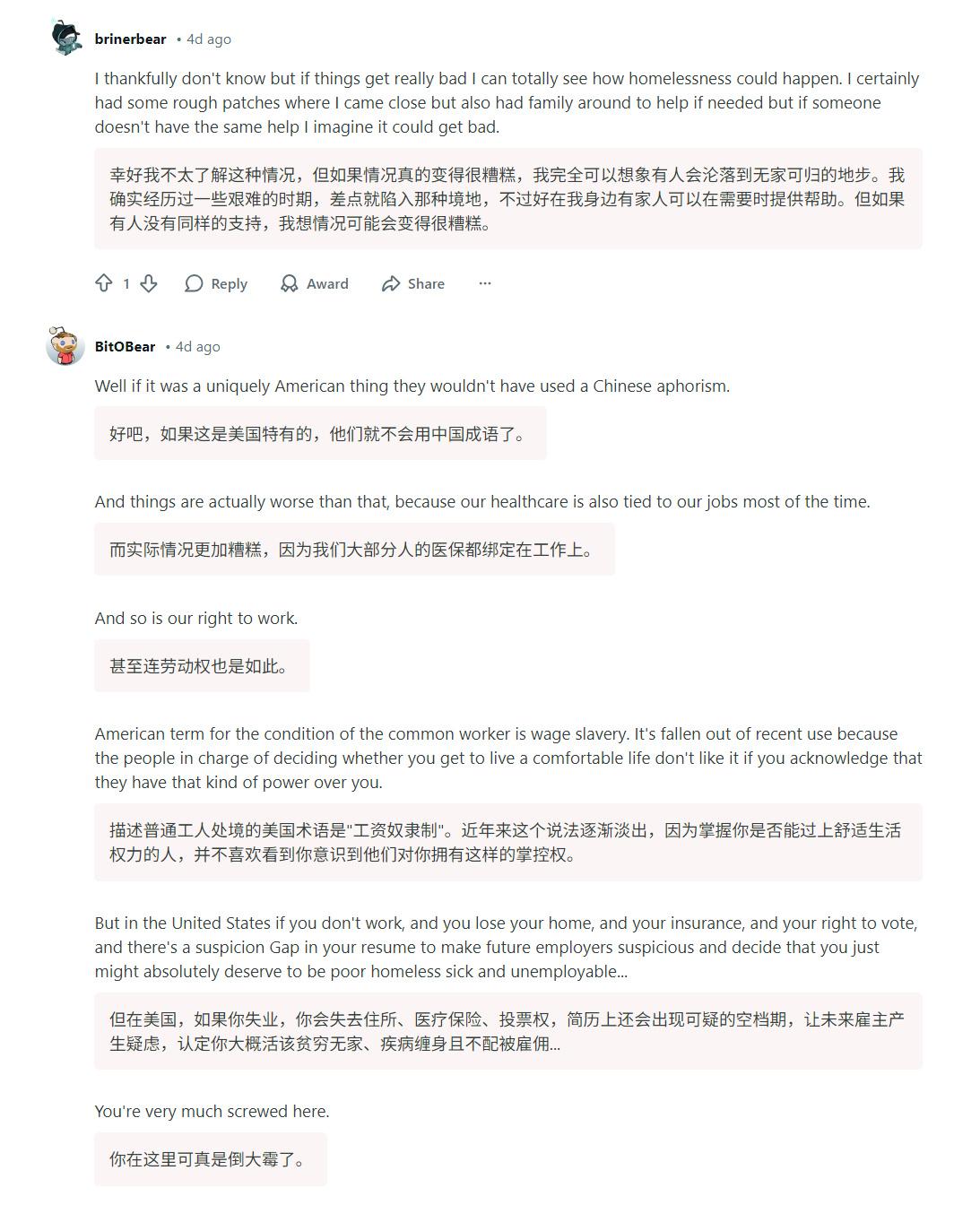 美国人坚定的认为,美国有斩杀线(生死线、生存线)。 “这一说非常贴切。或许可以用这个比喻来解释无家可归的现象:大多数人离生存线比离财富线更近。” “绝大多数人的经济状况实际上都处在这条线下,只是不愿承认罢了。说服人们认识到这一点确实很难。” “这比喻真TM绝了,我太喜欢了。” 一些假美国人需要的不是一个真实客观的美国,而是令人景仰的“地上神国——美国”。 有的人开始在发小作文给斩杀线洗地,说牢A造谣,反对斩杀线一说。 美国的这个制度太狠了,一环扣一环。绝大多数人如果没有什么基础,也没有家庭支持的话,在美国应该待不下去了。 而如果在G内,至少有住处(大不了回农村种地),有车的可以开网约车,无车的可以买一个电动自行车送外卖。实在连踏板车也不愿意买,就可以学三和大神,用日租电动车去跑外卖,赚了几百元又可以躺好几天。 全球网友在看热闹,美国网友表示坚决承认,只有那个群体在急!好难猜哦。 一个甜甜圈顶一个S,彻底粉碎了一部分人对美国美好生活的幻境。一个牢A顶十个S,连美国本土的美国人都受到深刻影响:由高傲转为自卑。