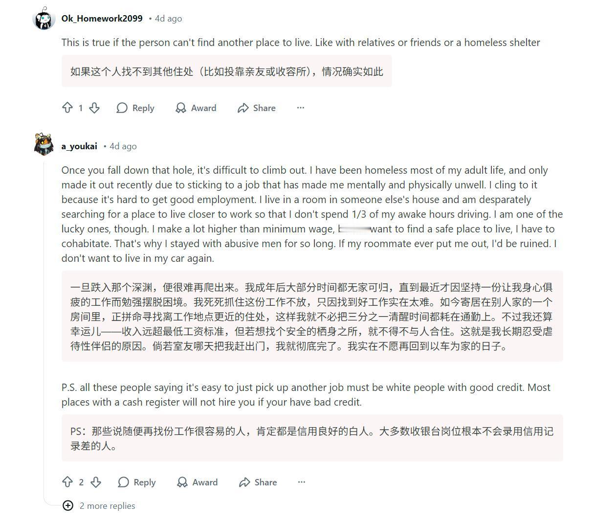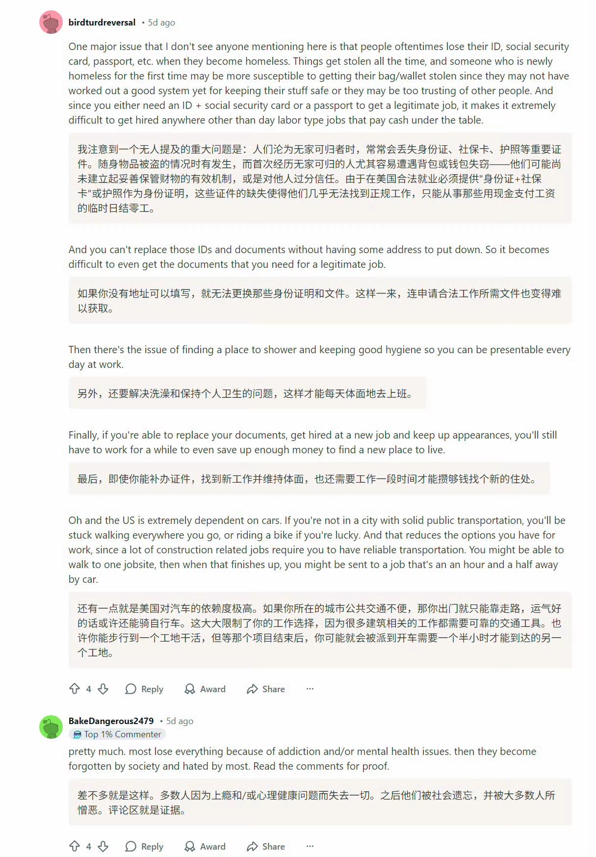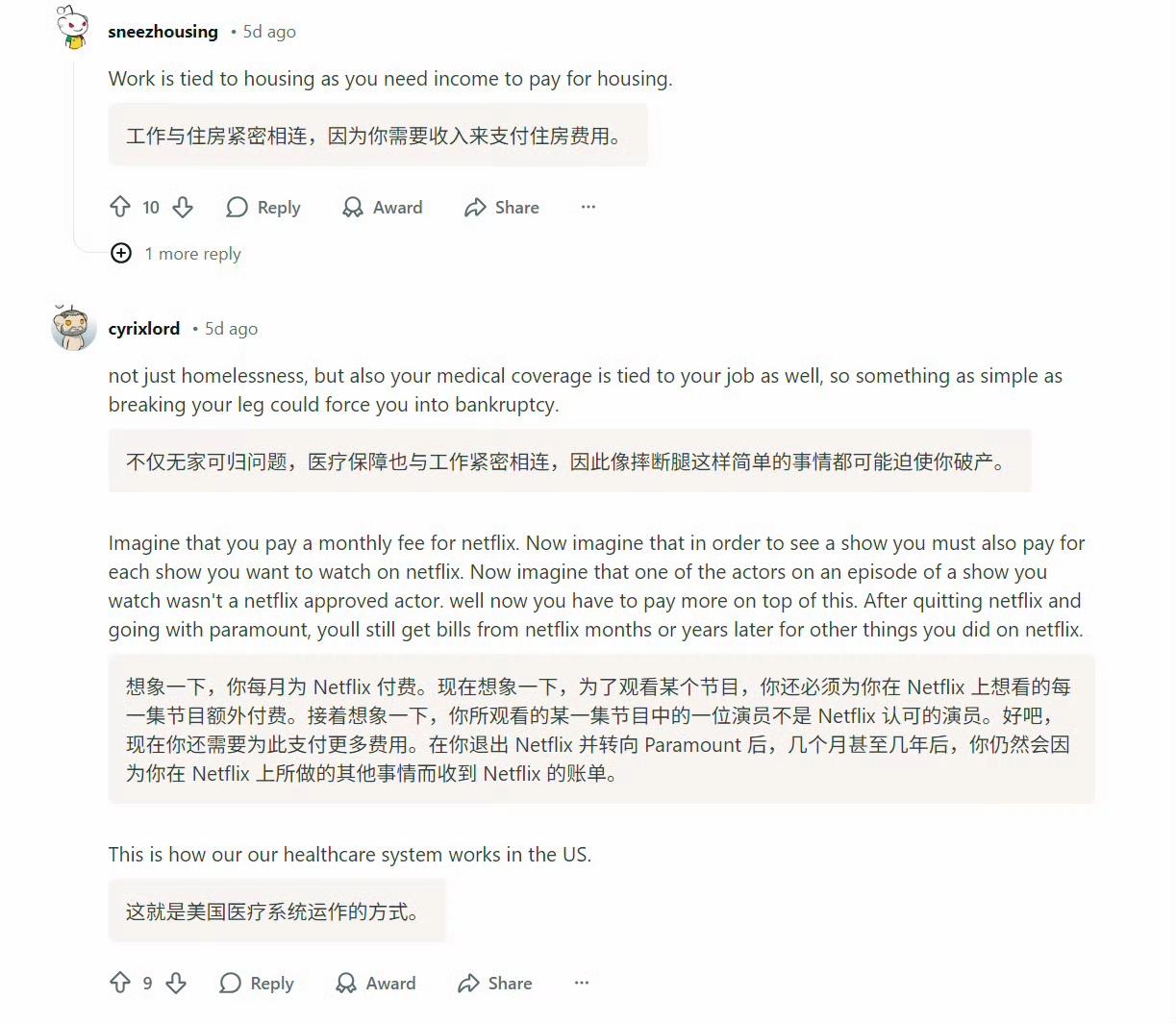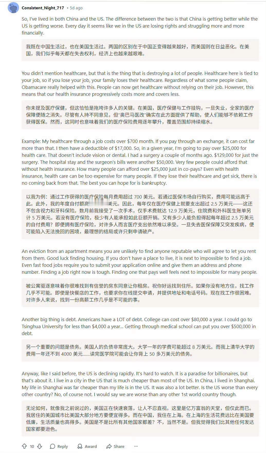 美国人坚定的认为,美国有斩杀线(生死线、生存线)。 “这一说非常贴切。或许可以用这个比喻来解释无家可归的现象:大多数人离生存线比离财富线更近。” “绝大多数人的经济状况实际上都处在这条线下,只是不愿承认罢了。说服人们认识到这一点确实很难。” “这比喻真TM绝了,我太喜欢了。” 一些假美国人需要的不是一个真实客观的美国,而是令人景仰的“地上神国——美国”。 有的人开始在发小作文给斩杀线洗地,说牢A造谣,反对斩杀线一说。 美国的这个制度太狠了,一环扣一环。绝大多数人如果没有什么基础,也没有家庭支持的话,在美国应该待不下去了。 而如果在G内,至少有住处(大不了回农村种地),有车的可以开网约车,无车的可以买一个电动自行车送外卖。实在连踏板车也不愿意买,就可以学三和大神,用日租电动车去跑外卖,赚了几百元又可以躺好几天。 全球网友在看热闹,美国网友表示坚决承认,只有那个群体在急!好难猜哦。 一个甜甜圈顶一个S,彻底粉碎了一部分人对美国美好生活的幻境。一个牢A顶十个S,连美国本土的美国人都受到深刻影响:由高傲转为自卑。