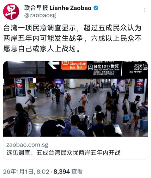 新加坡联合早报1月1日报道:“台湾一项民意调查显示,超过五成民众认为两岸五年内可能发生战争,六成以上民众不愿意自己或家人上战场。” 这组数字不是随便的民意结果,而是台湾民众打心底里对“台独”分裂势力挑事引发战火的深深恐惧,也是直接的抗拒。真要是到了战争爆发的那一天,估计95%以上的台湾民众都会不愿意自己或家人去打仗。 这份民调结果不是没根据的,背后就是台海局势一直紧张的实际情况。台湾《远见》杂志12月31日公布了“2026民心动向调查”,结果显示50.3%的台湾民众认为未来五年两岸可能爆发战争。 其中20.2%的人觉得“很有可能”,30.1%的人认为“有点可能”,而觉得不可能的比例只有40.7%。更值得关注的是,在“是否愿意让自己或家人上战场”这个问题上,63.9%的民众都给出了否定答案。 其中45.9%的人“很不愿意”,18%的人“不太愿意”,愿意参战的比例只占25%。不管是支持哪个党派的人,大多都有这种想法。就算是泛绿阵营的支持者,也有32%不愿意让家人卷入战火。 民众党和泛蓝阵营的支持者,不愿的比例更高,分别达到91%和86.9%。看得出来,反对战争、想避开战争已经成了不管支持哪个党派的台湾民众的主流想法。 民众对战争的焦虑,根源就在“台独”分裂势力一步步往前凑的挑衅,还有外部势力一直在旁边拱火。2024年赖清德执政以来,民进党当局的“台独”做法越来越明目张胆。 他们不仅在“就职演说”“双十”讲话里反复兜售“新两国论”,还在12月强行修改所谓的“两岸人民关系条例”,故意不让两岸正常来往。 更危险的是,他们还公然勾结外部势力,附和日本首相高市早苗“台湾有事就是日本有事”的错误说法。他们还拿出1.25兆新台币的高额军费,心甘情愿当美国“以台制华”的棋子,把台湾一步步推向打仗的危险边缘。 而解放军在2025年12月29日启动的“正义使命-2025”演习,就是对“台独”分裂势力和外部干涉的严厉警告。 多兵种一起行动,演习范围覆盖了台湾海峡和台岛多个关键区域,形成了全方位的包围管控,让台湾民众真切感受到战争离自己越来越近,这也直接让社会上的危机意识更强烈了。 台湾民众不愿意参战,背后是他们看清了“台独”的真面目,更是对战争残酷代价的深深害怕。“两岸政策协会”研究员吴瑟致分析说,民众不愿意让家人上战场,一方面是天生就怕战争,另一方面也受到“怀疑美国靠不住”和两岸战力差距大这些舆论的影响。 其实,台湾社会早就看明白了,“台独”分子嘴里说的“保卫台湾”,不过是骗民众跟着他们走的谎言。他们真正想保卫的,是自己的分裂私利。民进党当局执政这么久,民生问题一点没改善,反而在“台独”的路上越走越远。 2025年12月29日军演的时候,台中市突然毫无预警地大规模停电,9675户民众陷入黑暗,医护人员只能靠手电筒照明工作。这样的治理水平,让民众看得明明白白,这样的当局根本没能力保护民众,更不值得为他们的分裂主张付出生命代价。 同时,俄乌冲突、巴以冲突的残酷现实就摆在眼前,让台湾民众深刻知道,战争意味着家园被破坏,亲人被分开。而台湾地方小,战略资源又少,一旦开战根本没有可以缓冲的空间。那些说“战争就像台风,一会儿就过去了”的说法,不过是“台独”势力自己骗自己的拙劣表演。 更关键的是,台湾民众早就对“靠着美国对抗大陆”的虚幻承诺失去了信心。过去一段时间,美国不断卖给台湾武器,还派政客窜访台湾,表面上像是在给台湾“撑腰”,实际上是把台湾当成遏制大陆的棋子,不断消耗台湾的资源和安全。 当美国强行要求台积电去美国建厂,当“怀疑美国靠不住”的想法在台湾社会越来越多人认同,民众慢慢明白,外部势力根本不会真正为台湾的安危出手,所谓的“安全承诺”不过是看得见摸不着的空话。 民调也显示,58.3%的台湾民众支持“恢复两岸谈判、放宽民间交流”来维护安全,只有28.2%的人赞成“增加军购预算强化防务”。这说明民众已经看清楚了,只有两岸和平交流才是安全的根本保障,而不是走穷兵黩武的“台独”之路。 两岸同胞本来就是同根同源、同文同种,和平发展、一起赚钱共赢是大家心里都想这么做的,也是挡不住的大趋势。2024年,尽管民进党当局拼命阻挠,还是有三百多万人次的台湾民众参与两岸交流。 大陆和台湾的进出口贸易额同比增长了9%,台商在大陆新开办的企业数量也在稳步上升。这些都证明,两岸同胞渴望交流、期盼和平的心声是挡不住的。 而“台独”分裂势力对着历史大势干,不断挑战两岸关系的底线,只会把台湾推向战争的边缘,最终一定会遭到全体中华儿女的坚决反对,也会受到历史的公正审判。