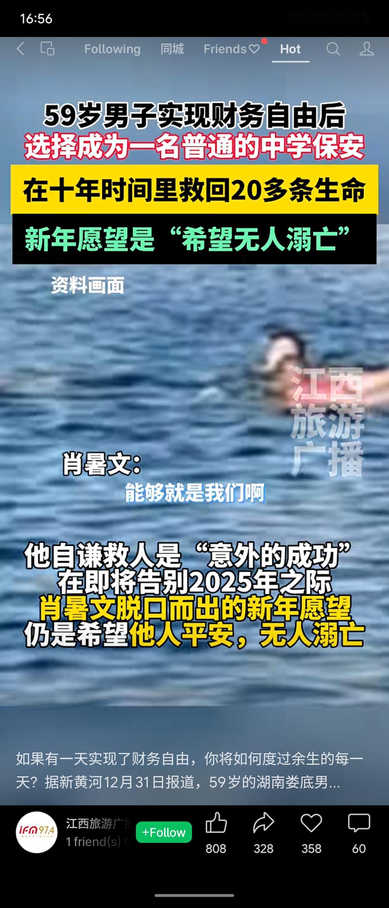 湖南男子肖暑文59岁实现财务自由后,选择担任中学保安。十年来,他坚持在江边义务巡逻,已成功救回20余名溺水者。他自谦这是“意外的成功”,其新年愿望朴素而崇高:希望无人溺亡。