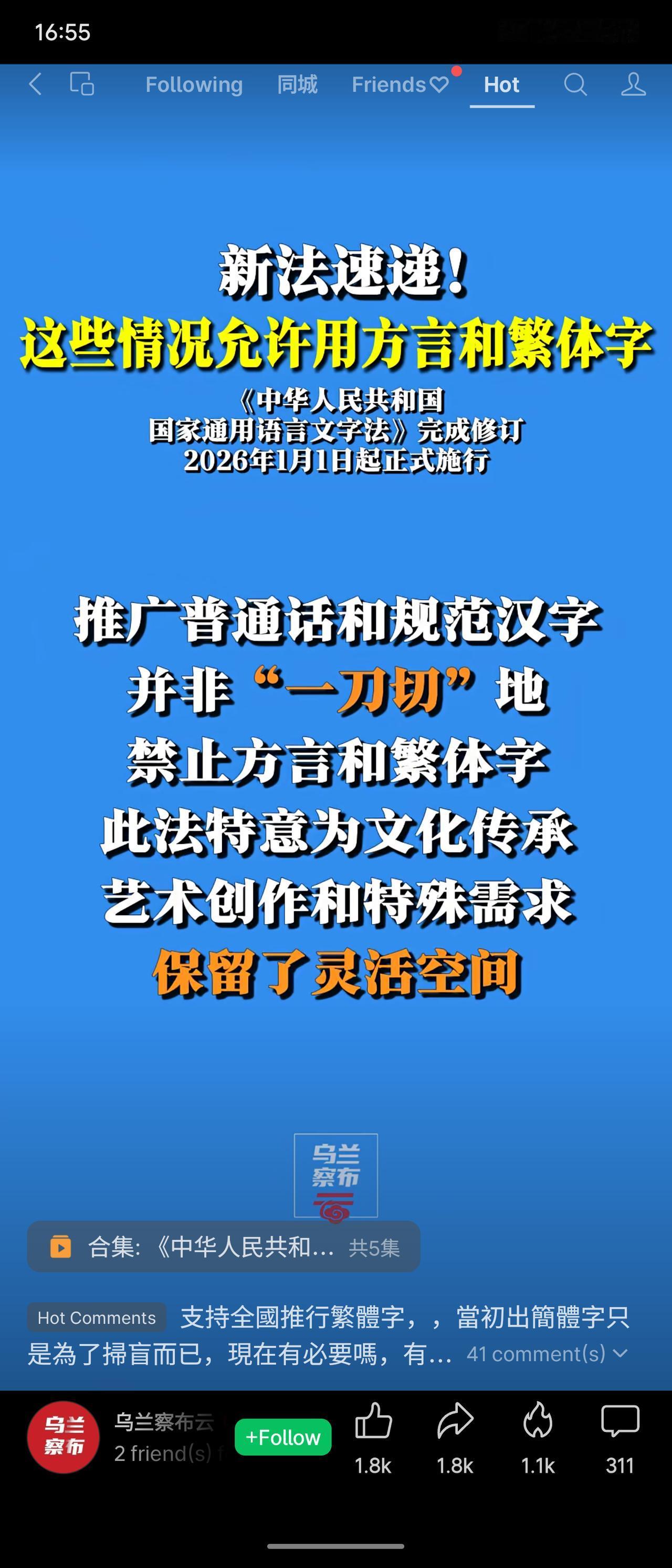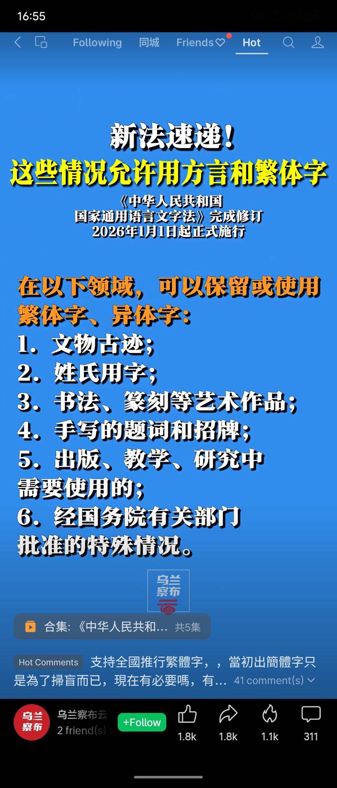 修订后的《国家通用语言文字法》于2026年1月1日施行,明确在公务、广播电视、艺术创作及研究等特定情况下可使用方言;在文物古迹、姓氏、书法艺术及研究等领域可保留或使用繁体字。此次修订在推广普通话与规范汉字的同时,为文化传承与特殊需求保留了灵活空间,体现了原则性与包容性的平衡。