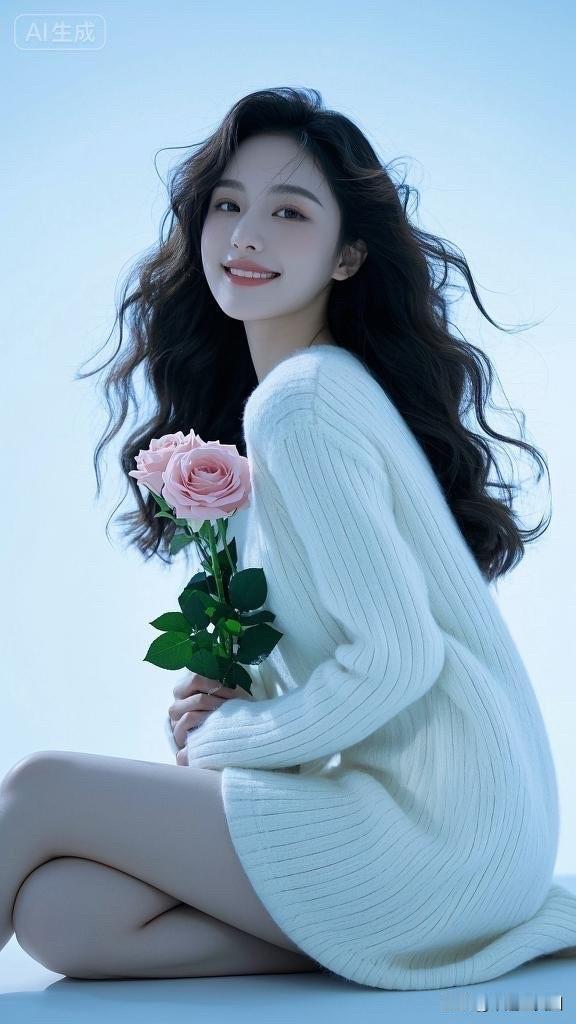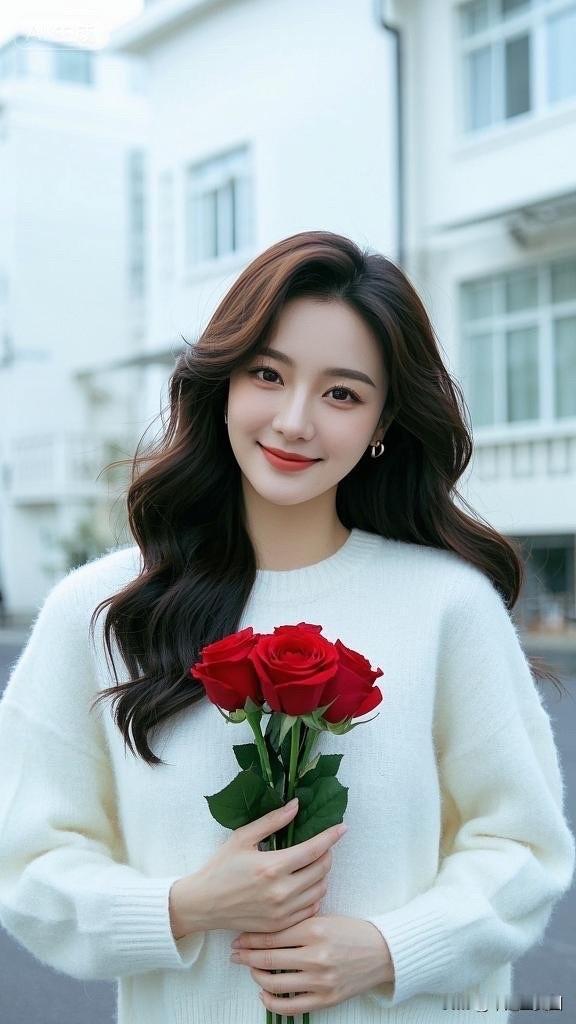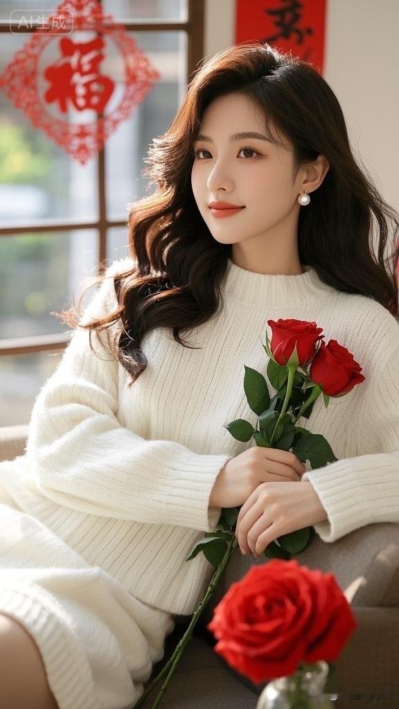 温柔微笑,手捧玫瑰,冬日里的暖阳