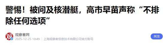 高市早苗在接受采访时不仅提到了中方,而且还再次声称未来不排除在海军潜艇上使用核动力的可能性。 她接受《读卖新闻》采访时,不光特意提到了中方,还再次说以后不排除在海军潜艇上用核动力。一句“我们不排除任何选项”,话里全是危险的信号。 所谓的“不排除任何选项”,说白了就是想摸着石头过河,一步步往核武装的方向蹭。这种在敏感问题上含糊其辞的说法,不是随口说说的。这是日本右翼势力一直想推动军事右倾化,又一次公开的试探。 要知道,高市早苗本来就是日本右翼保守势力的代表。她能上台执政,本身就说明日本政治在往右转。在军事和安保问题上,她一直都是激进的态度。 这次说核动力潜艇的事,也不是第一次提了。早在之前,她就公开支持搞核潜艇的想法,甚至不管法律规定,说这并不违宪,只是需要“把相关事情理清楚”。 这次特意选在元旦这个有特殊意义的时间点再提一遍,明显是故意的。她想借着新年的舆论机会,再试试国内外对日本突破军事限制的反应,为以后推进相关事情铺垫氛围。 更让人警惕的是,她采访时特意提中方,这点心思很明显。无非是想拿“周边安全环境”当借口,为日本发展能进攻的军事力量找理由。把中方当成“假想敌”来推进自己的军事扩张,这套路日本右翼早就用惯了。 更关键的是,这不是高市早苗一个人在瞎折腾。她的手下和自民党内的右翼同伙,早就开始提前放风,营造舆论了。就在去年12月18日,日本首相官邸里一个负责安全保障政策的官员,公然对着媒体说“日本应该拥有核武器”。 这话比高市早苗直白多了,直接把日本右翼想搞核武装的野心摆到了明面上。这番话一出来,立马引起了大震动。日本国内朝野各界都强烈批评,要求把这个官员撤职。 周边国家也都纷纷发出了严正警告。除了这个官员,自民党安全保障调查会长小野寺五典也在电视节目里公开说,有必要讨论一下“无核三原则”的定位。 他还透露,自民党计划在今年2月向内阁提交相关提议,推动国会讨论。要知道,“无核三原则”是日本战后和平发展的重要基础,明确规定不拥有、不制造、不引进核武器。小野寺五典说这话,本质上就是在为突破这个原则探路。 其实,日本右翼势力想推动核相关的军事扩张,早就有预谋了,不是一时兴起。去年10月,自民党和日本维新会签的联合执政文件里,就明确说要推动搞“下一代推进系统”的潜艇。 这就是在为研发和装备核动力潜艇开绿灯。之前防卫省的专家小组提交的报告里,还特意用了“不受传统方式限制的新一代能源”这种含糊的说法。 这就让外界猜测,日本是不是在考虑核动力。从法律上来说,日本的《原子能基本法》明确规定,核能的研究和使用只能用于和平目的。拥有核动力潜艇,明显违反了这个法律条文。 就连之前的内阁官房长官林芳正都承认,“按照现行法律的解释,日本很难拥有核潜艇”。但高市早苗政府根本不管这些,反而一个劲地推动相关讨论。他们甚至计划修改“无核三原则”里“不运进”核武器的条款。这突破法律约束、想搞核武装的野心,已经藏不住了。 高市早苗政府这一系列危险的举动,已经引起了日本国内和国际社会的广泛警惕和反对。在日本国内,前首相石破茂明确表示,要是日本拥有核武器,就必须退出《不扩散核武器条约》。 这还会让支撑日本能源体系的核能政策没法实施,“对日本来说绝对不是好事”。在野党公明党党首齐藤铁夫也说,“搞核武不仅会让日本在外交上被孤立,还会严重恶化本国的安全环境”。他还要求罢免之前说要拥核的那个官员。 日本原子弹氢弹受害者团体协会更是发表声明,痛斥这种言论无视原子弹受害者的遭遇,是在纵容核战争,绝对不能容忍。周边国家方面,中国、俄罗斯和朝鲜都先后就此发出了严正警告。朝鲜外务省日本研究所所长直接说,“热爱和平的人们必须坚决制止日本这个战犯国家的危险军事妄想”。 值得注意的是,高市早苗这个时候密集推动核相关的军事议题,背后明显有政治算计。她上台之后,日本社会往右转的趋势越来越明显。但她的执政基础并不稳固,经济政策没效果,民生问题一大堆,导致支持率一个劲地往下掉。 这种情况下,她就想通过炒作安全议题、渲染外部威胁来转移国内民众的注意力。同时,也能借着这个机会巩固右翼势力的支持。把中方拉进话题里,更是想靠着美国的核保护伞,抱紧美国的大腿。 对于这种破坏地区和平稳定的危险动向,国际社会必须高度警惕,坚决反对。