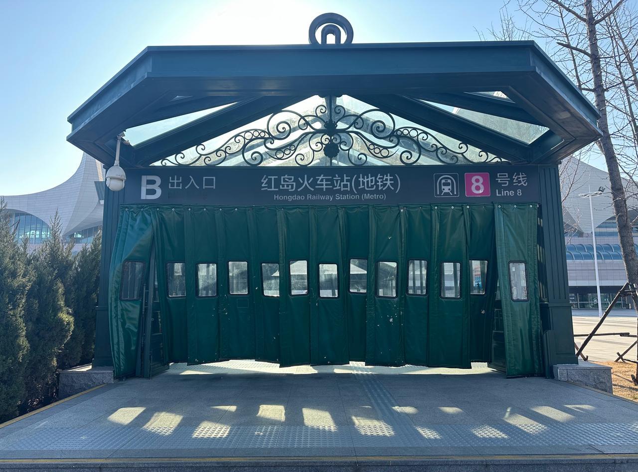 【青岛地铁啄木鸟】𝟒𝟗𝟗𝟒.门匾站牌 🚇8号线 红岛火车站A 图1/图2: ①出入口门匾站牌与同站已开通的B、K出入口以及线网其他交通枢纽地铁站出入口门匾站牌在站名后面增加中英文的半角括号“(地铁)”“(Metro)”不一致(参照图3/图4 英文括号前面应规范空一格,中英文括号均为半角) ②重新更换门匾站牌时需要顺带将国标“地铁”图形更改为新版国标图形,注意8号线线路色色差,站名“红岛火车站(地铁)”无需有字间距 ————————————————————