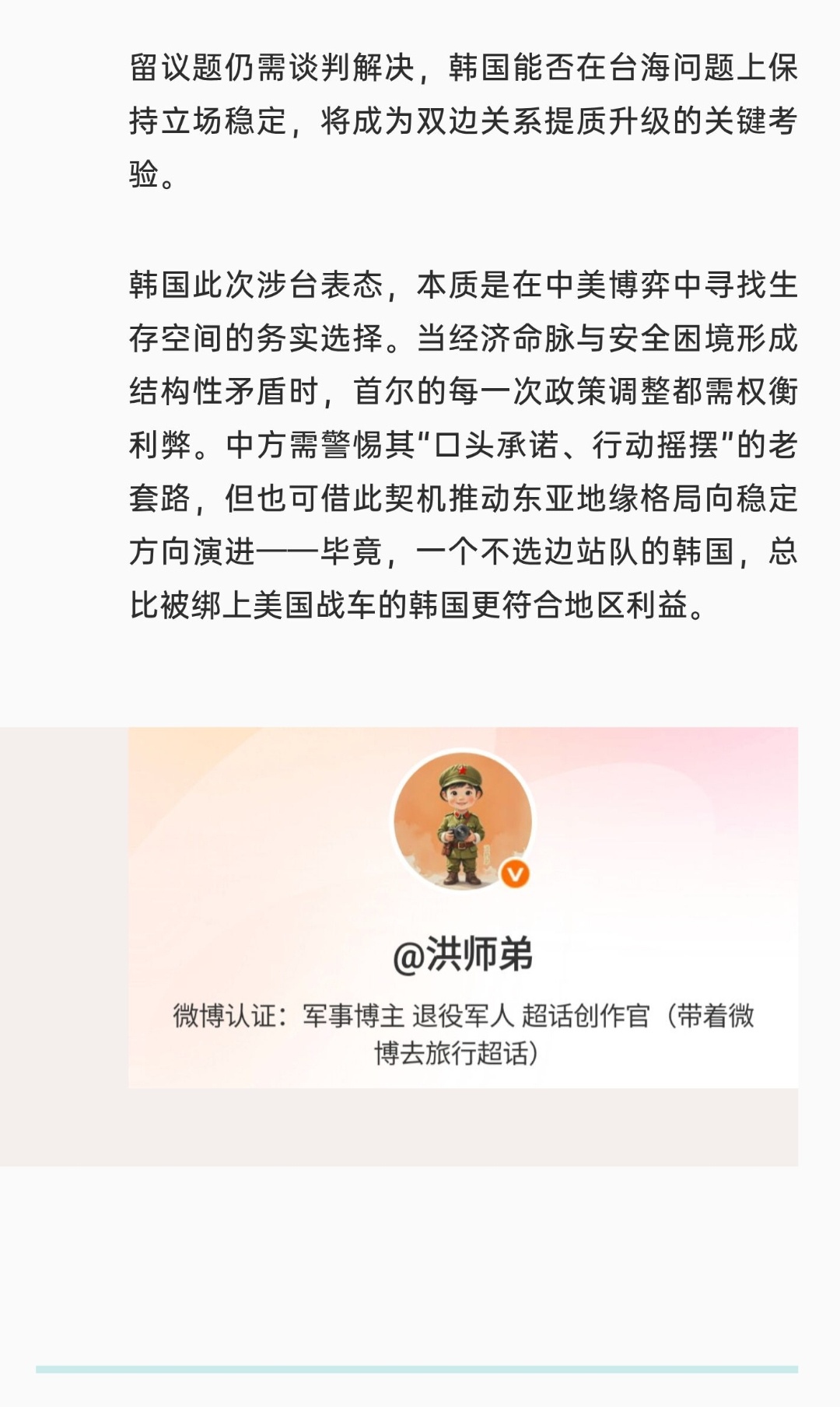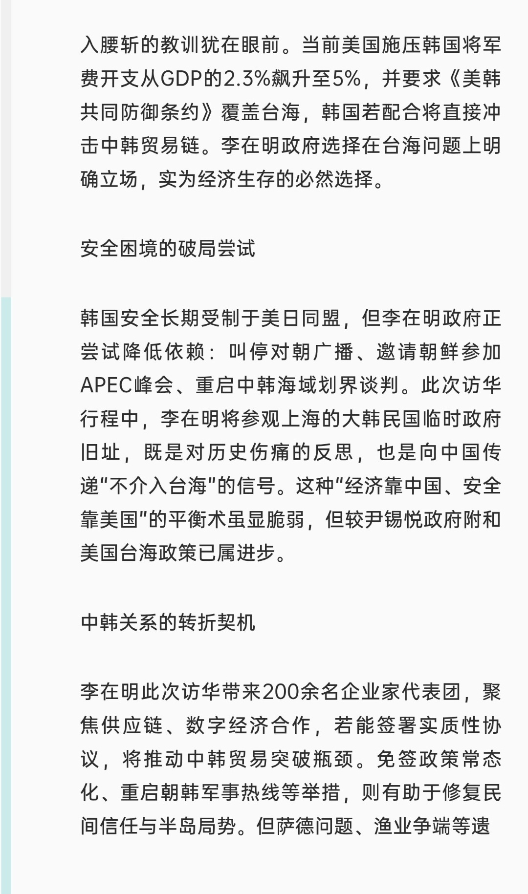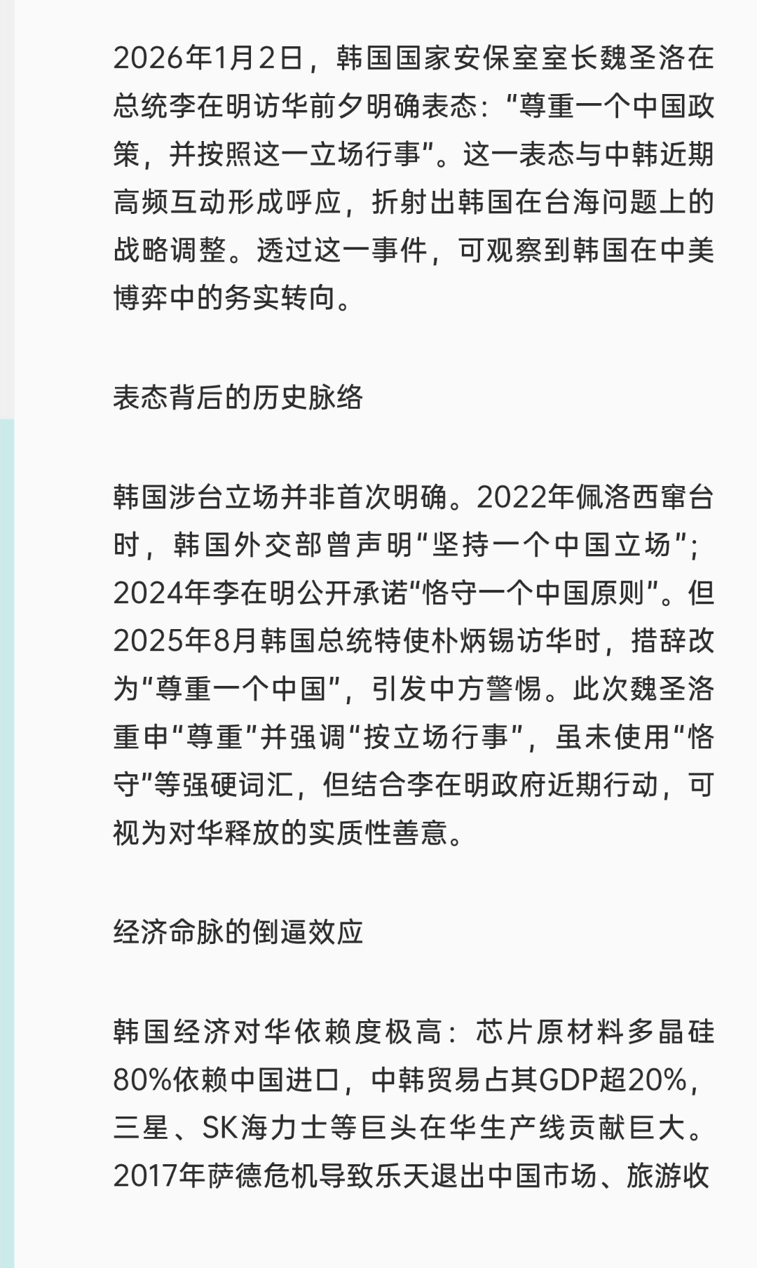 | 2026年1月2日,韩国国家安保室室长魏圣洛在总统李在明访华前夕明确表态:“尊重一个中国政策,并按照这一立场行事”。这一表态与中韩近期高频互动形成呼应,折射出韩国在台海问题上的战略调整。透过这一事件,可观察到韩国在中美博弈中的务实转向。韩国涉台立场并非首次明确。2022年佩洛西窜台时,韩国外交部曾声明“坚持一个中国立场”;2024年李在明公开承诺“恪守一个中国原则”。但2025年8月韩国总统特使朴炳锡访华时,措辞改为“尊重一个中国”,引发中方警惕。此次魏圣洛重申“尊重”并强调“按立场行事”,虽未使用“恪守”等强硬词汇,但结合李在明政府近期行动,可视为对华释放的实质性善意。韩国经济对华依赖度极高:芯片原材料多晶硅80%依赖中国进口,中韩贸易占其GDP超20%,三星、SK海力士等巨头在华生产线贡献巨大。2017年萨德危机导致乐天退出中国市场、旅游收入腰斩的教训犹在眼前。当前美国施压韩国将军费开支从GDP的2.3%飙升至5%,并要求《美韩共同防御条约》覆盖台海,韩国若配合将直接冲击中韩贸易链。李在明政府选择在台海问题上明确立场,实为经济生存的必然选择。韩国安全长期受制于美日同盟,但李在明政府正尝试降低依赖:叫停对朝广播、邀请朝鲜参加APEC峰会、重启中韩海域划界谈判。此次访华行程中,李在明将参观上海的大韩民国临时政府旧址,既是对历史伤痛的反思,也是向中国传递“不介入台海”的信号。这种“经济靠中国、安全靠美国”的平衡术虽显脆弱,但较尹锡悦政府附和美国台海政策已属进步。李在明此次访华带来200余名企业家代表团,聚焦供应链、数字经济合作,若能签署实质性协议,将推动中韩贸易突破瓶颈。免签政策常态化、重启朝韩军事热线等举措,则有助于修复民间信任与半岛局势。但萨德问题、渔业争端等遗留议题仍需谈判解决,韩国能否在台海问题上保持立场稳定,将成为双边关系提质升级的关键考验。韩国此次涉台表态,本质是在中美博弈中寻找生存空间的务实选择。当经济命脉与安全困境形成结构性矛盾时,首尔的每一次政策调整都需权衡利弊。中方需警惕其“口头承诺、行动摇摆”的老套路,但也可借此契机推动东亚地缘格局向稳定方向演进——毕竟,一个不选边站队的韩国,总比被绑上美国战车的韩国更符合地区利益。