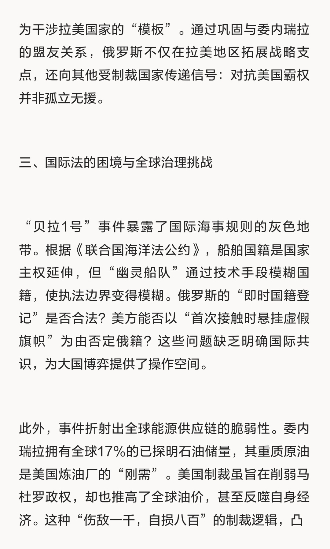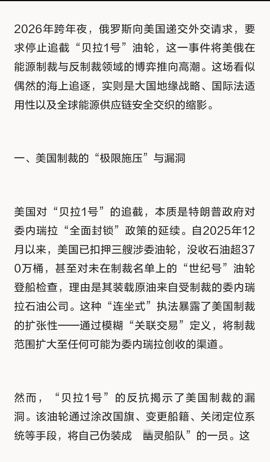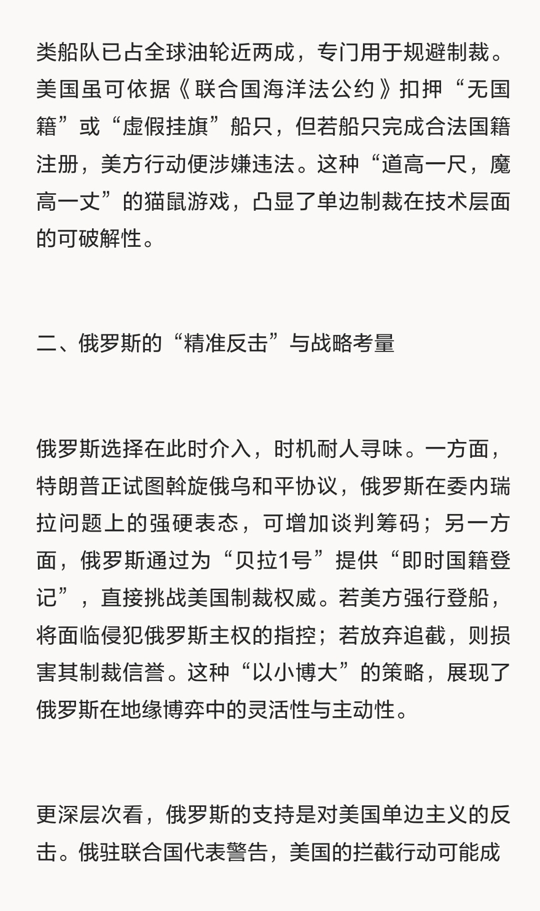 | 2026年跨年夜,俄罗斯向美国递交外交请求,要求停止追截“贝拉1号”油轮,这一事件将美俄在能源制裁与反制裁领域的博弈推向高潮。美国对“贝拉1号”的追截,本质是特朗普政府对委内瑞拉“全面封锁”政策的延续。自2025年12月以来,美国已扣押三艘涉委油轮,没收石油超370万桶,甚至对未在制裁名单上的“世纪号”油轮登船检查,理由是其装载原油来自受制裁的委内瑞拉石油公司。这种“连坐式”执法暴露了美国制裁的扩张性——通过模糊“关联交易”定义,将制裁范围扩大至任何可能为委内瑞拉创收的渠道。该油轮通过涂改国旗、变更船籍、关闭定位系统等手段,将自己伪装成“幽灵船队”的一员。这类船队已占全球油轮近两成,专门用于规避制裁。美国虽可依据《联合国海洋法公约》扣押“无国籍”或“虚假挂旗”船只,但若船只完成合法国籍注册,美方行动便涉嫌违法。这种“道高一尺,魔高一丈”的猫鼠游戏,凸显了单边制裁在技术层面的可破解性。俄罗斯选择在此时介入,时机耐人寻味。一方面,特朗普正试图斡旋俄乌和平协议,俄罗斯在委内瑞拉问题上的强硬表态,可增加谈判筹码;另一方面,俄罗斯通过为“贝拉1号”提供“即时国籍登记”,直接挑战美国制裁权威。若美方强行登船,将面临侵犯俄罗斯主权的指控;若放弃追截,则损害其制裁信誉。这种“以小博大”的策略,展现了俄罗斯在地缘博弈中的灵活性与主动性。俄驻联合国代表警告,美国的拦截行动可能成为干涉拉美国家的“模板”。通过巩固与委内瑞拉的盟友关系,俄罗斯不仅在拉美地区拓展战略支点,还向其他受制裁国家传递信号:对抗美国霸权并非孤立无援。根据《联合国海洋法公约》,船舶国籍是国家主权延伸,但“幽灵船队”通过技术手段模糊国籍,使执法边界变得模糊。俄罗斯的“即时国籍登记”是否合法?美方能否以“首次接触时悬挂虚假旗帜”为由否定俄籍?这些问题缺乏明确国际共识,为大国博弈提供了操作空间。委内瑞拉拥有全球17%的已探明石油储量,其重质原油是美国炼油厂的“刚需”。美国制裁虽旨在削弱马杜罗政权,却也推高了全球油价,甚至反噬自身经济。这种“伤敌一千,自损八百”的制裁逻辑,凸显了全球能源治理的失灵。“贝拉1号”油轮的命运,或许只是美俄博弈中的一枚棋子,但它揭示的制裁与反制裁逻辑、国际法适用性争议以及能源安全困境,却具有普遍意义。在全球化深度绑定的今天,单边主义与多边主义的较量、技术手段与法律规则的碰撞,将持续重塑国际秩序。如何平衡国家利益与全球公共利益,将是未来国际治理的核心命题。