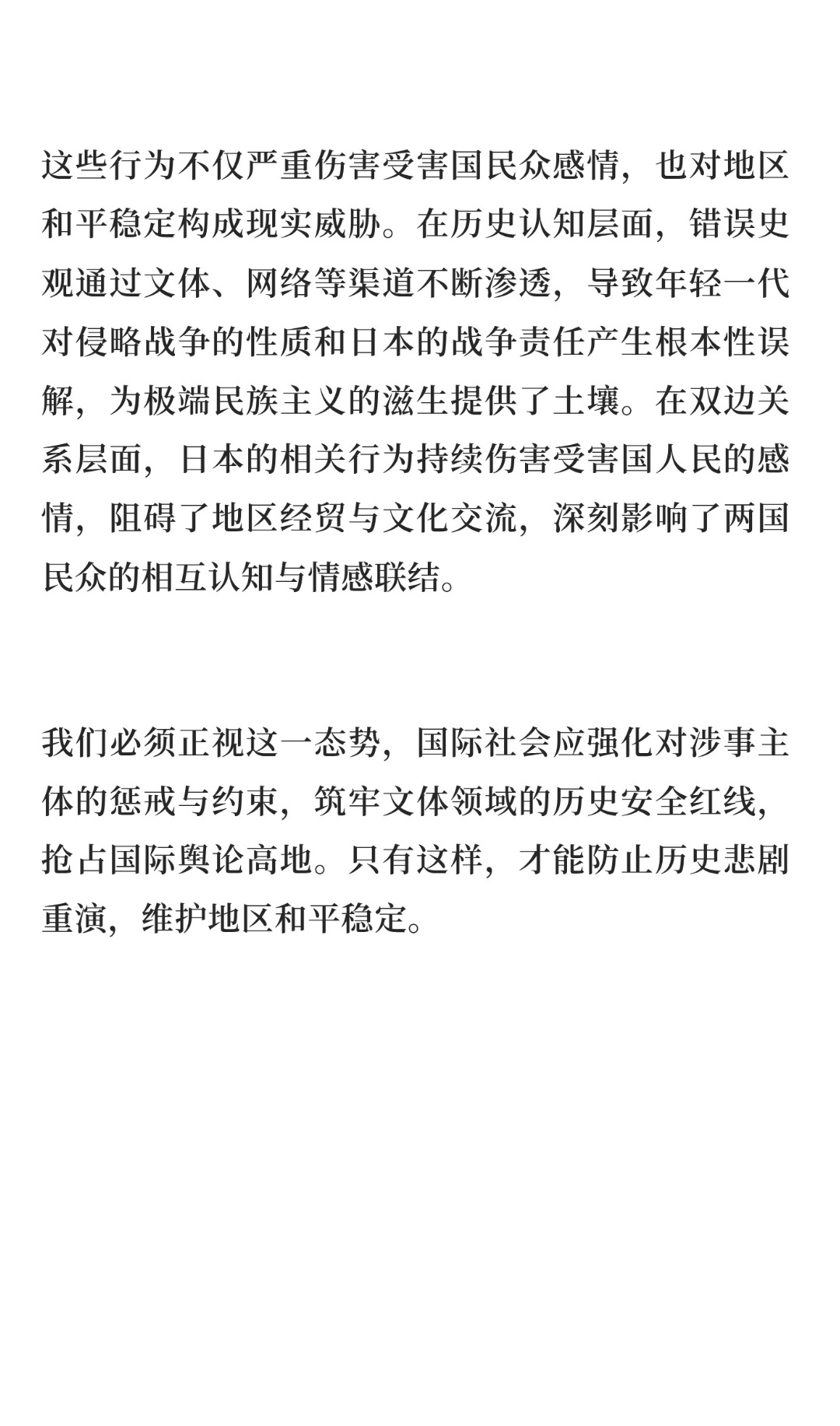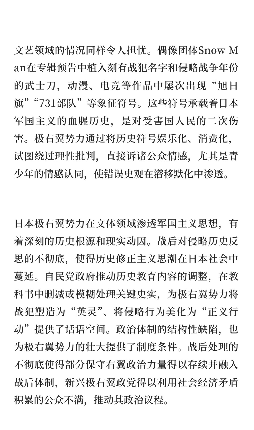 | 近期,日本文体界接连出现夹带军国主义元素的行为,引发亚洲各国人民的强烈不满。这些行为绝非偶然,而是日本极右翼势力有组织地利用文体活动影响公众认知、美化侵略历史的具体表现,其危害不容小觑。足球运动员三笘薰与二战战犯相关卡片合影,乒乓球运动员张本智和等人参拜供奉侵略战争战犯的东乡神社。这些行为严重伤害了曾饱受日本军国主义侵略的亚洲各国人民的感情。体育本应是促进国际交流与和平的桥梁,却被这些极右翼势力利用,成为传播错误史观的工具。偶像团体Snow Man在专辑预告中植入刻有战犯名字和侵略战争年份的武士刀,动漫、电竞等作品中屡次出现“旭日旗”“731部队”等象征符号。这些符号承载着日本军国主义的血腥历史,是对受害国人民的二次伤害。极右翼势力通过将历史符号娱乐化、消费化,试图绕过理性批判,直接诉诸公众情感,尤其是青少年的情感认同,使错误史观在潜移默化中渗透。日本极右翼势力在文体领域渗透军国主义思想,有着深刻的历史根源和现实动因。战后对侵略历史反思的不彻底,使得历史修正主义思潮在日本社会中蔓延。自民党政府推动历史教育内容的调整,在教科书中删减或模糊处理关键史实,为极右翼势力将战犯塑造为“英灵”、将侵略行为美化为“正义行动”提供了话语空间。政治体制的结构性缺陷,也为极右翼势力的壮大提供了制度条件。战后处理的不彻底使得部分保守右翼政治力量得以存续并融入战后体制,新兴极右翼政党得以利用社会经济矛盾积累的公众不满,推动其政治议程。这些行为不仅严重伤害受害国民众感情,也对地区和平稳定构成现实威胁。在历史认知层面,错误史观通过文体、网络等渠道不断渗透,导致年轻一代对侵略战争的性质和日本的战争责任产生根本性误解,为极端民族主义的滋生提供了土壤。在双边关系层面,日本的相关行为持续伤害受害国人民的感情,阻碍了地区经贸与文化交流,深刻影响了两国民众的相互认知与情感联结。我们必须正视这一态势,国际社会应强化对涉事主体的惩戒与约束,筑牢文体领域的历史安全红线,抢占国际舆论高地。只有这样,才能防止历史悲剧重演,维护地区和平稳定。