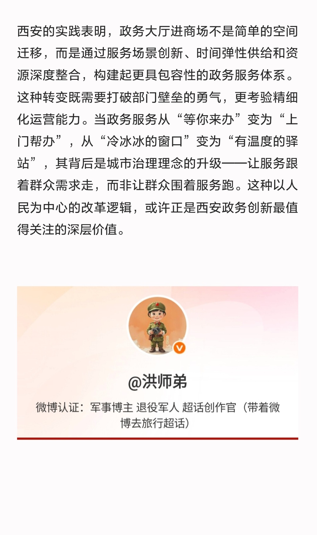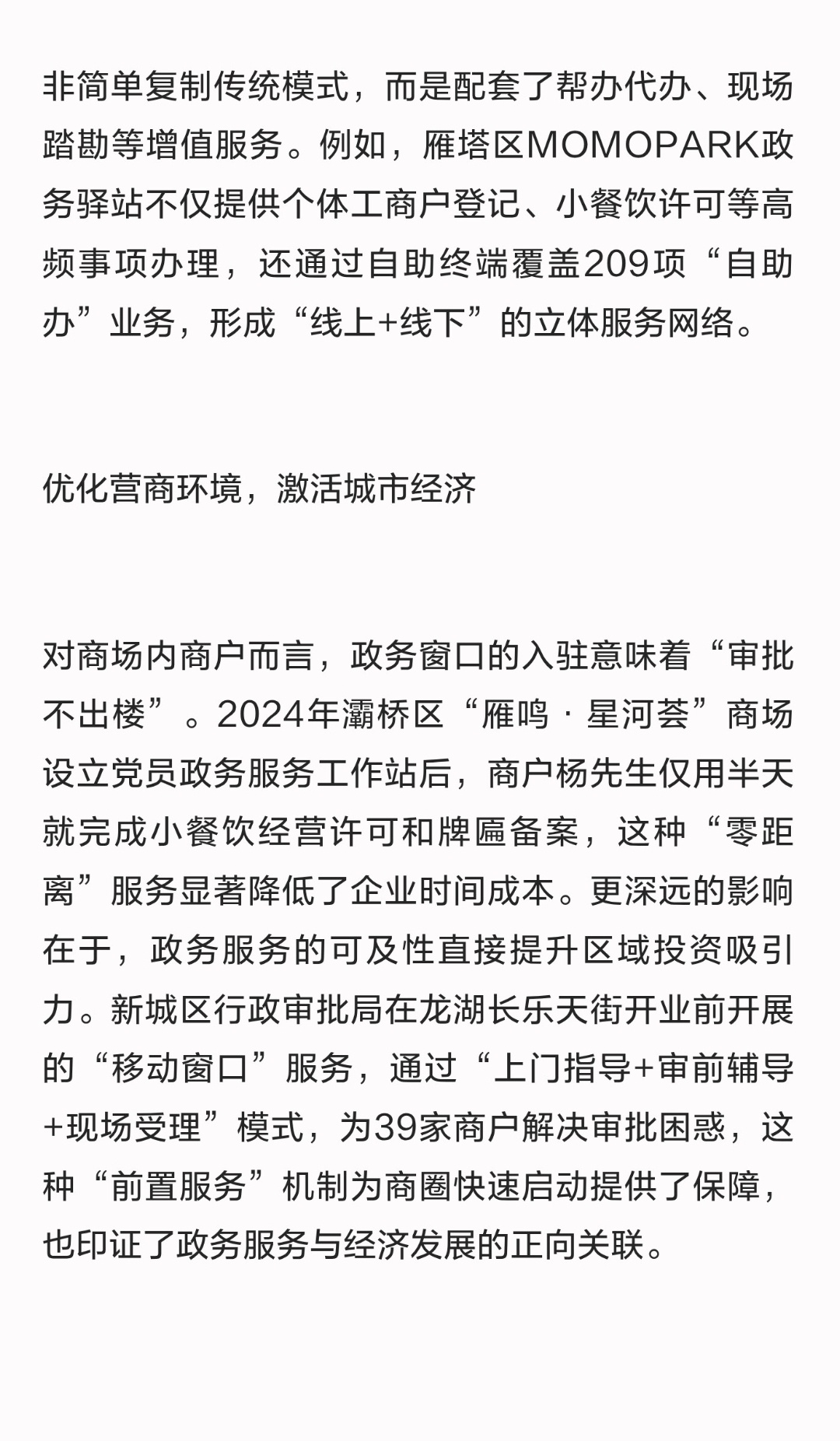 | 西安多个政务大厅搬进商场的举措,看似打破常规,实则是一场以需求为导向的服务革新。这种“服务下沉”模式不仅重构了政务服务的空间逻辑,更折射出城市治理从“管理型”向“服务型”的深层转型。传统政务大厅多选址于政府办公区,市民需专门安排时间前往办理业务。西安将政务窗口嵌入商场后,将“办事场景”与“生活场景”深度融合。以新城区政务服务中心为例,其新址位于解放路核心商圈,市民在购物、用餐间隙即可完成社保缴纳、营业执照申领等高频事项。这种“顺路办”模式尤其惠及上班族和商户——前者无需请假,后者在筹备开业期间可同步完成审批流程。2023年灞桥区华荣时代广场开业时,政务专班现场为20余家商户提供“坐等拿证”服务,正是这种场景重构的生动实践。西安政务大厅进商场后,普遍推行“周末无休”制度。新城区政务服务中心明确表示,搬迁后周六周日正常办理业务,未央区红星美凯龙政务大厅此前也已实施类似政策。这一改变直击“上班族办事难”痛点,将政务服务从“工作时间”延伸至“生活时间”。更值得关注的是,商场内的政务窗口并非简单复制传统模式,而是配套了帮办代办、现场踏勘等增值服务。例如,雁塔区MOMOPARK政务驿站不仅提供个体工商户登记、小餐饮许可等高频事项办理,还通过自助终端覆盖209项“自助办”业务,形成“线上+线下”的立体服务网络。对商场内商户而言,政务窗口的入驻意味着“审批不出楼”。2024年灞桥区“雁鸣•星河荟”商场设立党员政务服务工作站后,商户杨先生仅用半天就完成小餐饮经营许可和牌匾备案,这种“零距离”服务显著降低了企业时间成本。更深远的影响在于,政务服务的可及性直接提升区域投资吸引力。新城区行政审批局在龙湖长乐天街开业前开展的“移动窗口”服务,通过“上门指导+审前辅导+现场受理”模式,为39家商户解决审批困惑,这种“前置服务”机制为商圈快速启动提供了保障,也印证了政务服务与经济发展的正向关联。西安的实践表明,政务大厅进商场不是简单的空间迁移,而是通过服务场景创新、时间弹性供给和资源深度整合,构建起更具包容性的政务服务体系。这种转变既需要打破部门壁垒的勇气,更考验精细化运营能力。当政务服务从“等你来办”变为“上门帮办”,从“冷冰冰的窗口”变为“有温度的驿站”,其背后是城市治理理念的升级——让服务跟着群众需求走,而非让群众围着服务跑。这种以人民为中心的改革逻辑,或许正是西安政务创新最值得关注的深层价值。