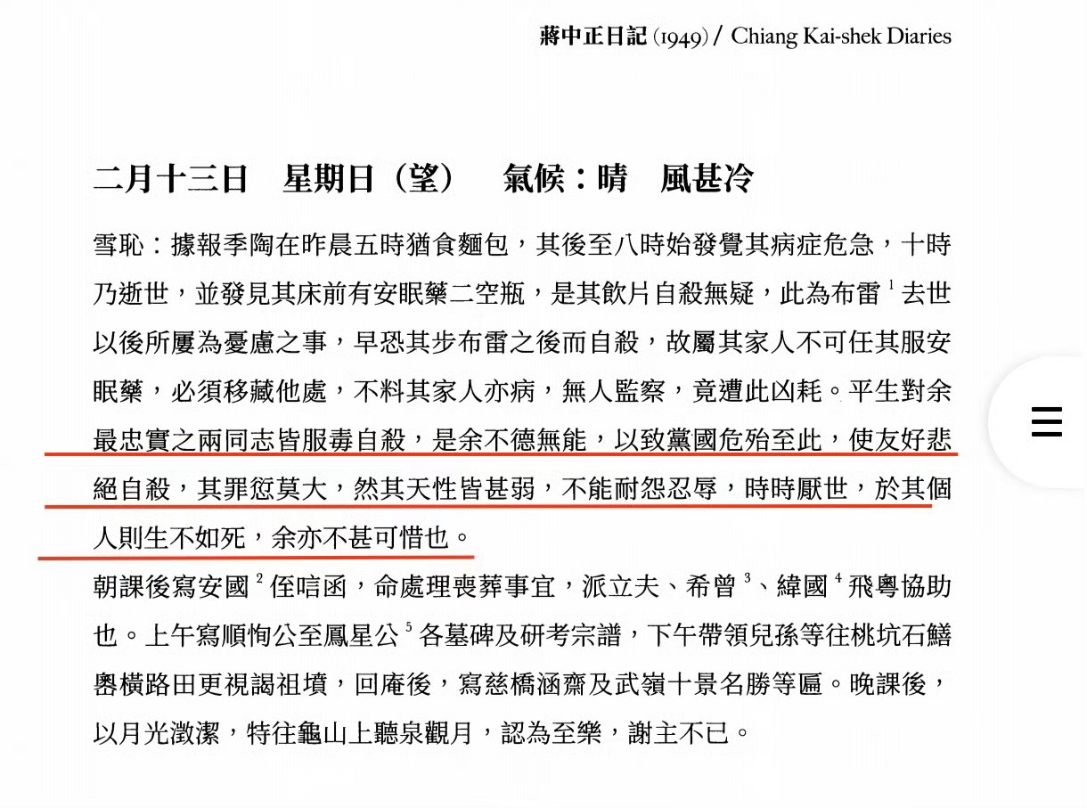 写日记就是人生作弊器蒋的日记原本可以去看了!免费扫描高清图像可以看!刚刚公开上线。¹ 姜文的台词“正经人谁写日记”是个段子,不是事实。事实是我们国家的大人物、小人物写日记的传统由来已久。这么说吧,你能叫得出名字的大人物都写日记。区别是目前有没有公开而已。² 大蒋、小蒋的日记里很多真话、很多骂人的话。能看出一个人几十年的脾气心性。比如图1:1927年戴季陶去找蒋,一通悲观言论,让蒋非常看不起。写日记说“甚嫌恶其悲观颓丧”。这应该是真心话。到了1949年2月11日,一辈子忠心耿耿、追随他的戴季陶自杀。蒋写日记还是说他,“天性皆甚弱,不能耐怨忍辱,时时厌世”。所以对戴季陶、陈布雷的自杀,“余亦不甚可惜也”。科学人医疗社会史