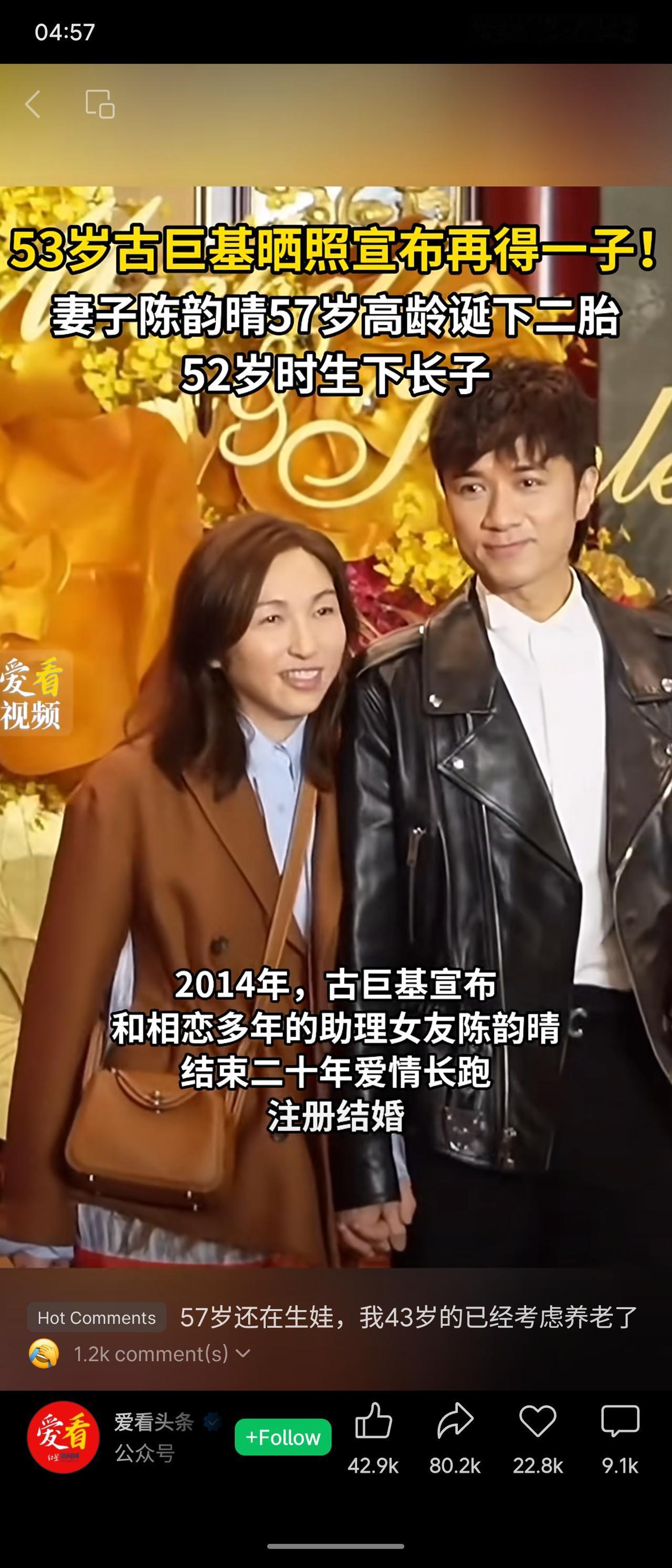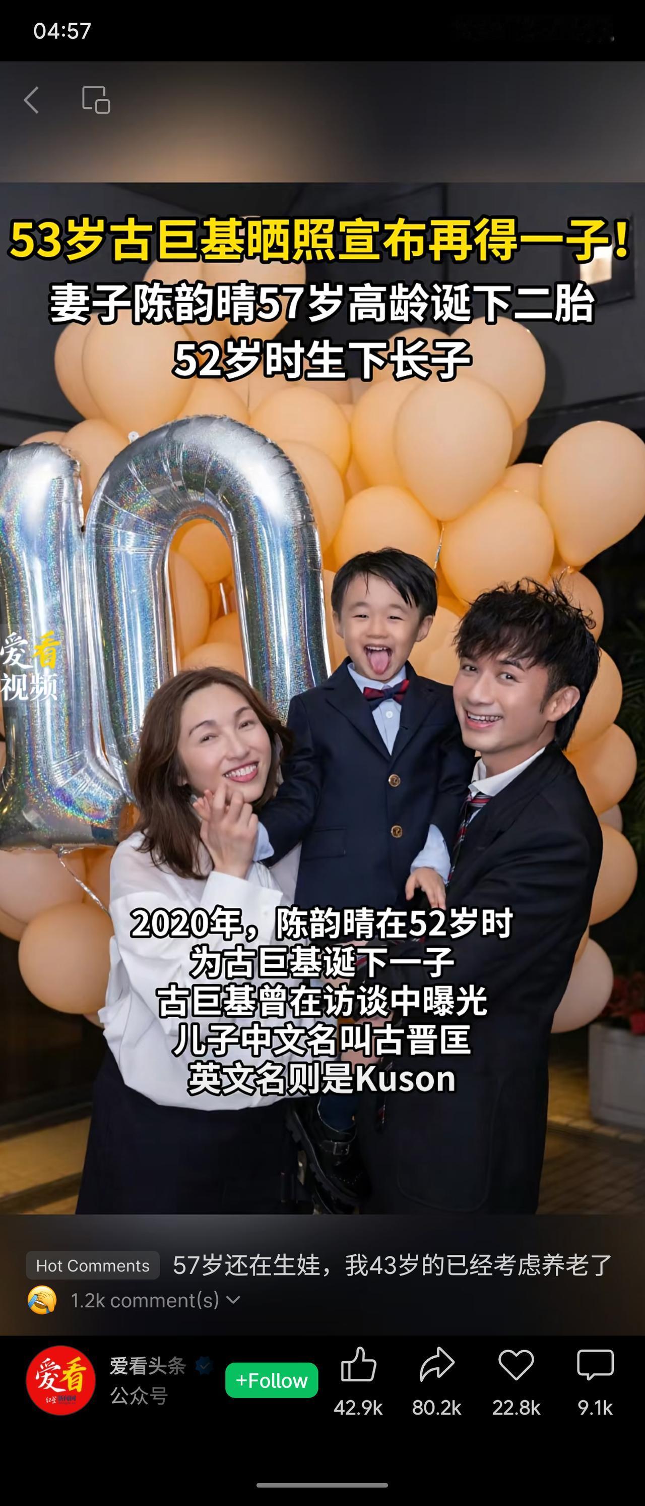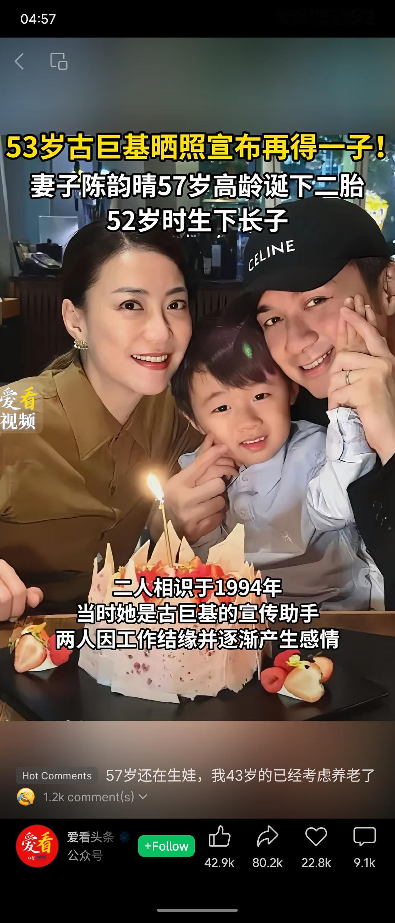 53岁歌手古巨基宣布再得一子,其57岁的妻子陈韵晴高龄诞下二胎。两人于1994年相识,女方曾是古巨基的宣传助手,相恋多年后结婚。妻子52岁时已诞下长子。此事因双方高龄生育引发网友关注与讨论。