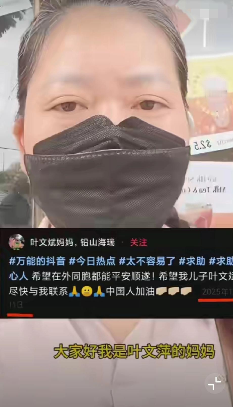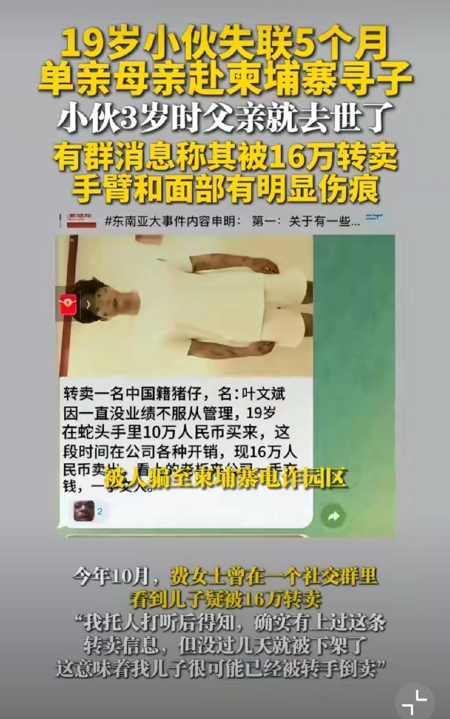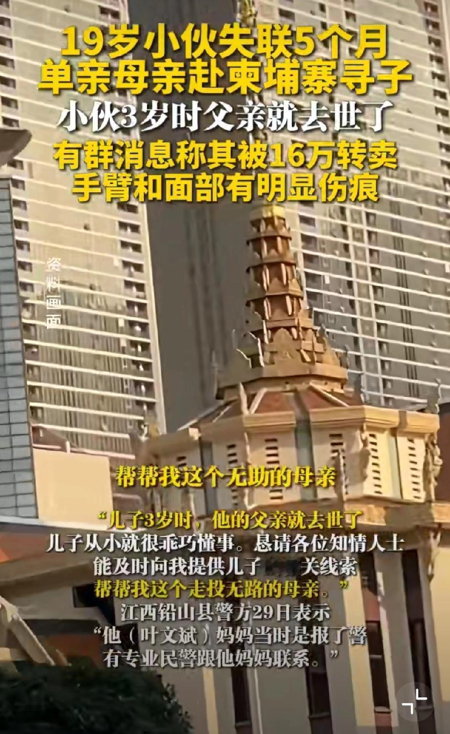 1月1日,江西铅山单亲妈妈去柬埔寨寻找19岁儿子叶文斌,母亲说离签证时间越来越短了,一无所获她心急如焚。她做了能做到的所有,现在毫无头绪独自坐车四处寻找。 去年10月,费女士曾在一个社交群里看到儿子被16万转卖“我托人打听后得知,确实有上过这条转卖信息,但没过几天就被下架了,这意味着我儿子很可能已被转手倒卖”从图片看是叶文斌且伤痕累累。柬埔寨男孩失踪 铅山叶文斌 叶文斌妈妈