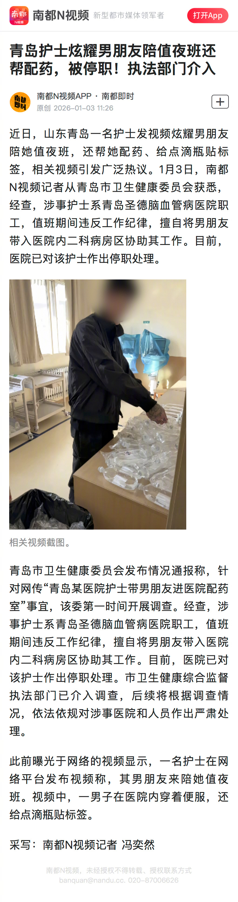 #青岛护士炫耀男友陪值班帮配药停职#【青岛护士炫耀男朋友陪值夜班还帮配药,被停职!执法部门介入】#执法部门介入青岛护士违规事件#近日,山东青岛一名护士发视频炫耀男朋友陪她值夜班,还帮她配药、给点滴瓶贴标签,相关视频引发广泛热议。1月3日,南都N视频记者从青岛市卫生健康委员会获悉,经查,涉事护士系青岛圣德脑血管病医院职工,值班期间违反工作纪律,擅自将男朋友带入医院内二科病房区协助其工作。目前,医院已对该护士作出停职处理。市卫生健康综合监督执法部门已介入调查,后续将根据调查情况,依法依规对涉事医院和人员作出严肃处理。南都N视频记者 冯奕然青岛护士炫耀男朋友陪值夜班还帮配药,被停职!执法部门介入
