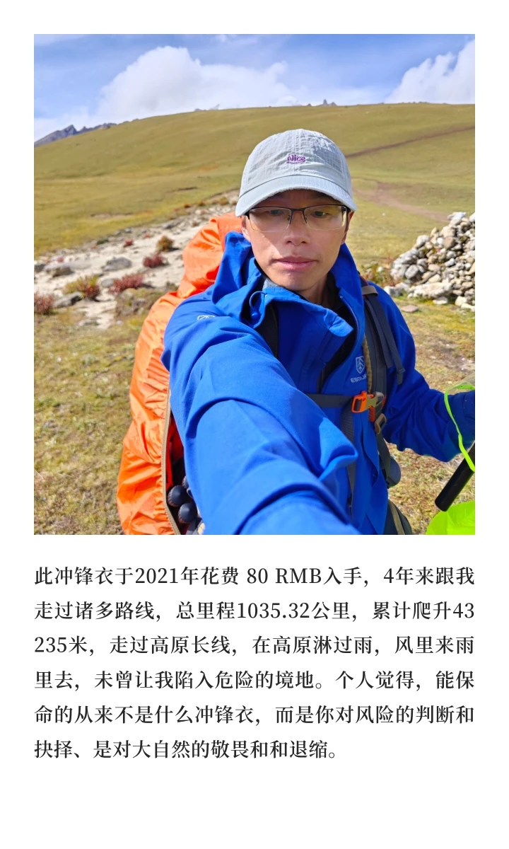 此冲锋衣于2021年花费 80 RMB入手,4年来跟我走过诸多路线,总里程1035.32公里,累计爬升43235米,走过高原长线,在高原淋过雨,风里来雨里去,未曾让我陷入危险的境地。个人觉得,能保命的从来不是什么冲锋衣,而是你对风险的判断和抉择、是对大自然的敬畏和退缩。