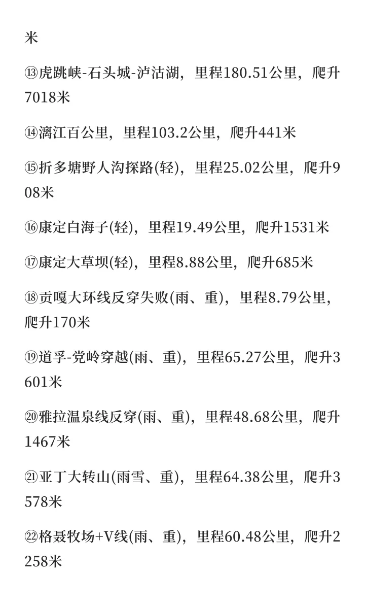 ⑥雨崩全线(雨,轻),里程68.66公里,爬升4581米