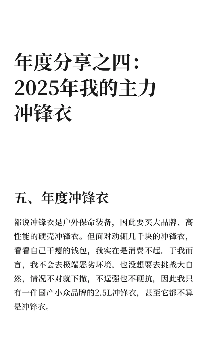 都说冲锋衣是户外保命装备,因此要买大品牌、高性能的硬壳冲锋衣。但面对动辄几千块的冲锋衣,看看自己干瘪的钱包,我实在是消费不起。于我而言,我不会去极端恶劣环境,也没想要去挑战大自然,情况不对就下撤,不逞强也不硬抗,因此我只有一件国产小众品牌的2.5L冲锋衣,甚至它都不算是冲锋衣。