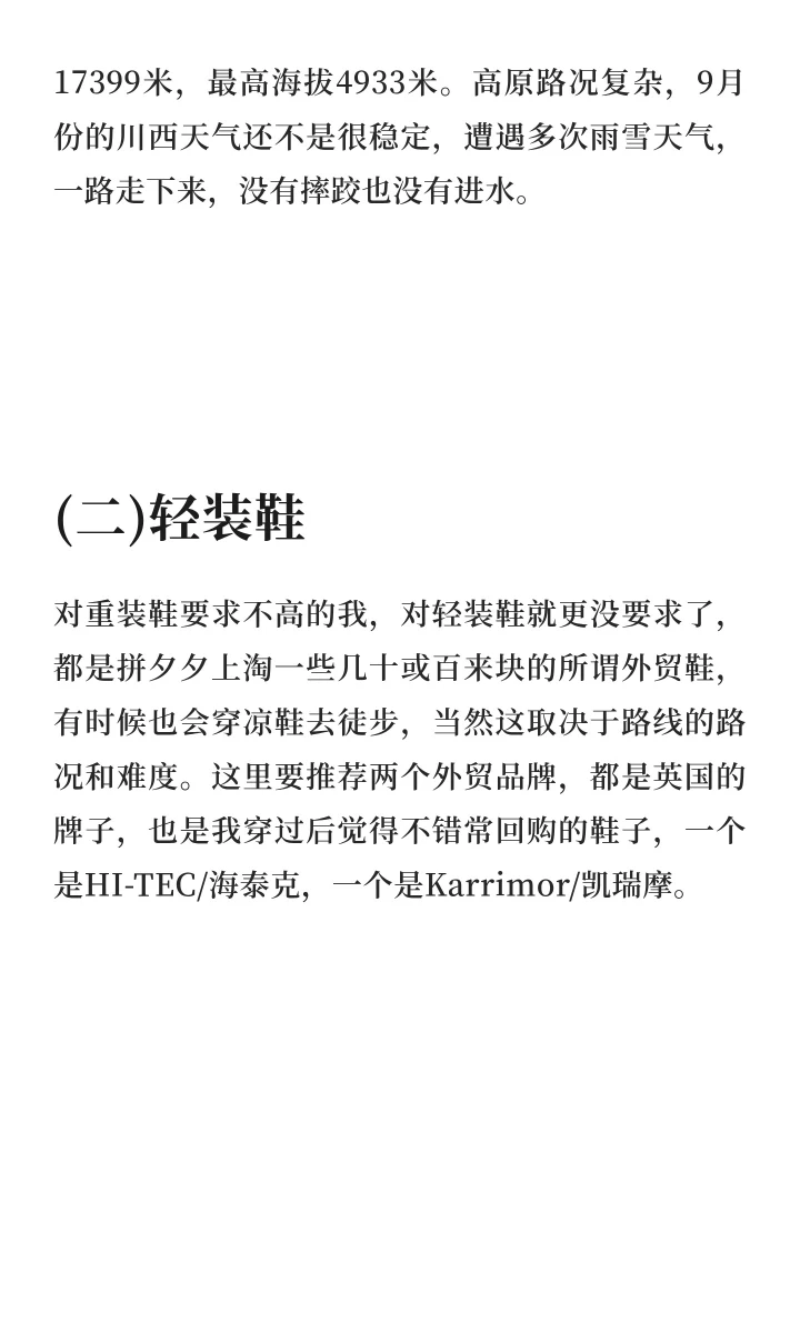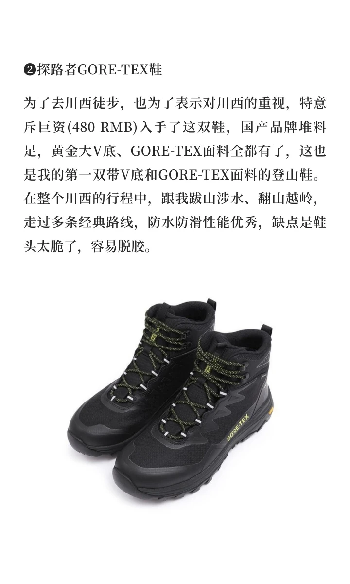 为了去川西徒步,也为了表示对川西的重视,特意斥巨资(480 RMB)入手了这双鞋,国产品牌堆料足,黄金大V底、GORE-TEX面料全都有了,这也是我的第一双带V底和GORE-TEX面料的登山鞋。在整个川西的行程中,跟我跋山涉水、翻山越岭,走过多条经典路线,防水防滑性能优秀,缺点是鞋头太脆了,容易脱胶。