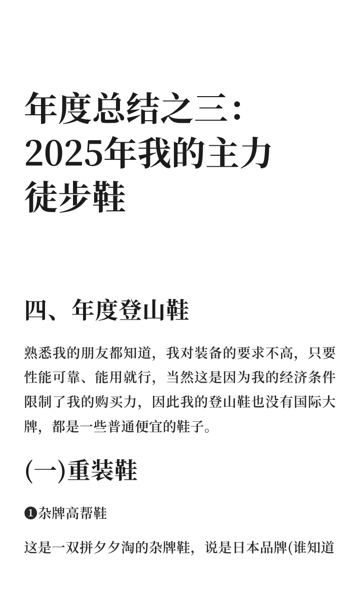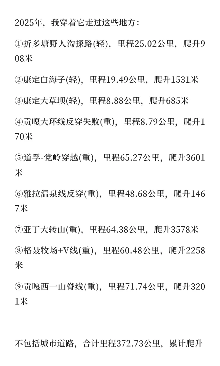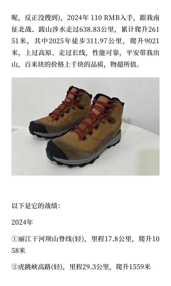 这是一双拼夕夕淘的杂牌鞋,2024年 110 RMB入手,跟我南征北战、跋山涉水走过638.83公里,累计爬升26151米,其中2025年徒步311.97公里,爬升9021米,上过高原、走过长线,性能可靠,多次平安带我出山,百来块的价格上千块的品质。