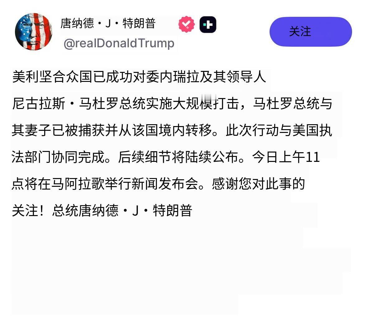 新闻快讯——“美利坚合众国已成功对委内瑞拉及其领导人尼古拉斯·马杜罗总统实施大规