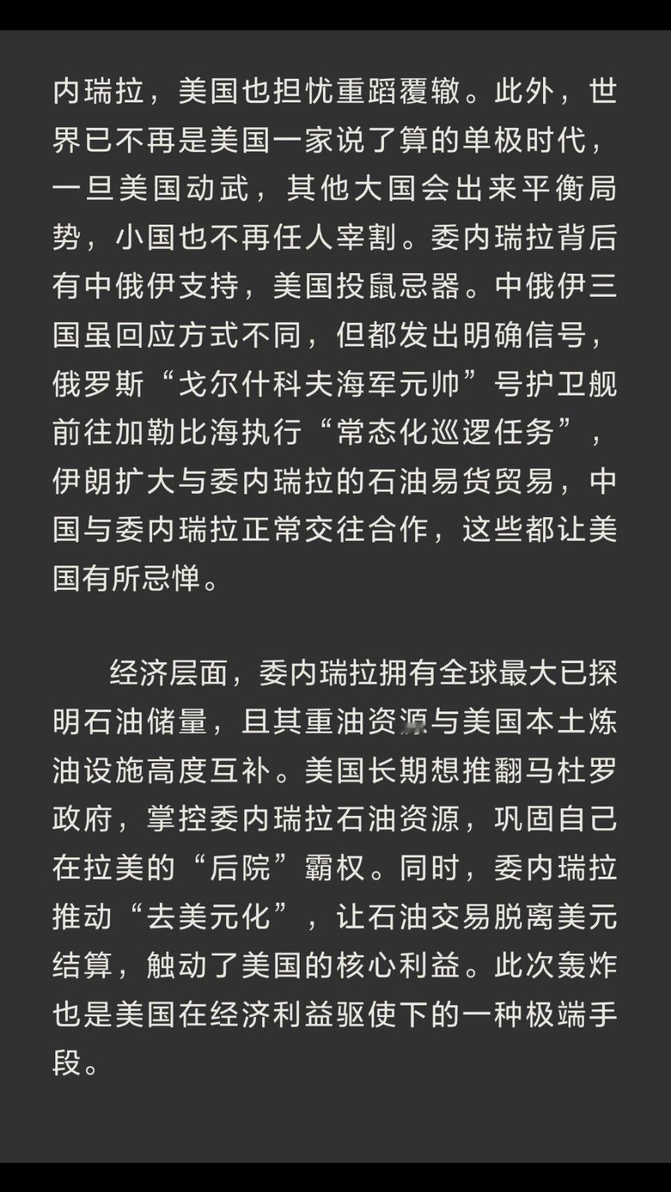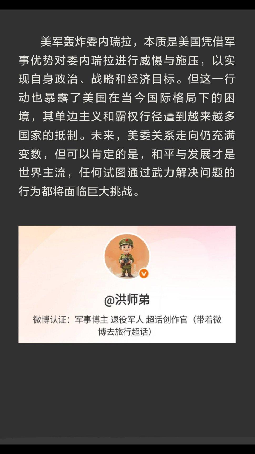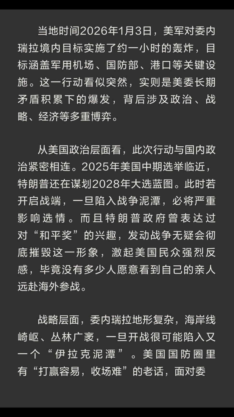 | 当地时间2026年1月3日,美军对委内瑞拉境内目标实施了约一小时的轰炸,目标涵盖军用机场、国防部、港口等关键设施。这一行动看似突然,实则是美委长期矛盾积累下的爆发。2025年美国中期选举临近,特朗普还在谋划2028年大选蓝图。此时若开启战端,一旦陷入战争泥潭,必将严重影响选情。而且特朗普政府曾表达过对“和平奖”的兴趣,发动战争无疑会彻底摧毁这一形象,激起美国民众强烈反感,毕竟没有多少人愿意看到自己的亲人远赴海外参战。战略层面,委内瑞拉地形复杂,海岸线崎岖、丛林广袤,一旦开战很可能陷入又一个“伊拉克泥潭”。美国国防圈里有“打赢容易,收场难”的老话,面对委内瑞拉,美国也担忧重蹈覆辙。此外,世界已不再是美国一家说了算的单极时代,一旦美国动武,其他大国会出来平衡局势,小国也不再任人宰割。委内瑞拉背后有中俄伊支持,美国投鼠忌器。中俄伊三国虽回应方式不同,但都发出明确信号,俄罗斯“戈尔什科夫海军元帅”号护卫舰前往加勒比海执行“常态化巡逻任务”,伊朗扩大与委内瑞拉的石油易货贸易,中国与委内瑞拉正常交往合作,这些都让美国有所忌惮。经济层面,委内瑞拉拥有全球最大已探明石油储量,且其重油资源与美国本土炼油设施高度互补。美国长期想推翻马杜罗政府,掌控委内瑞拉石油资源,巩固自己在拉美的“后院”霸权。同时,委内瑞拉推动“去美元化”,让石油交易脱离美元结算,触动了美国的核心利益。此次轰炸也是美国在经济利益驱使下的一种极端手段。美军轰炸委内瑞拉,本质是美国凭借军事优势对委内瑞拉进行威慑与施压,以实现自身政治、战略和经济目标。但这一行动也暴露了美国在当今国际格局下的困境,其单边主义和霸权行径遭到越来越多国家的抵制。未来,美委关系走向仍充满变数,但可以肯定的是,和平与发展才是世界主流,任何试图通过武力解决问题的行为都将面临巨大挑战。