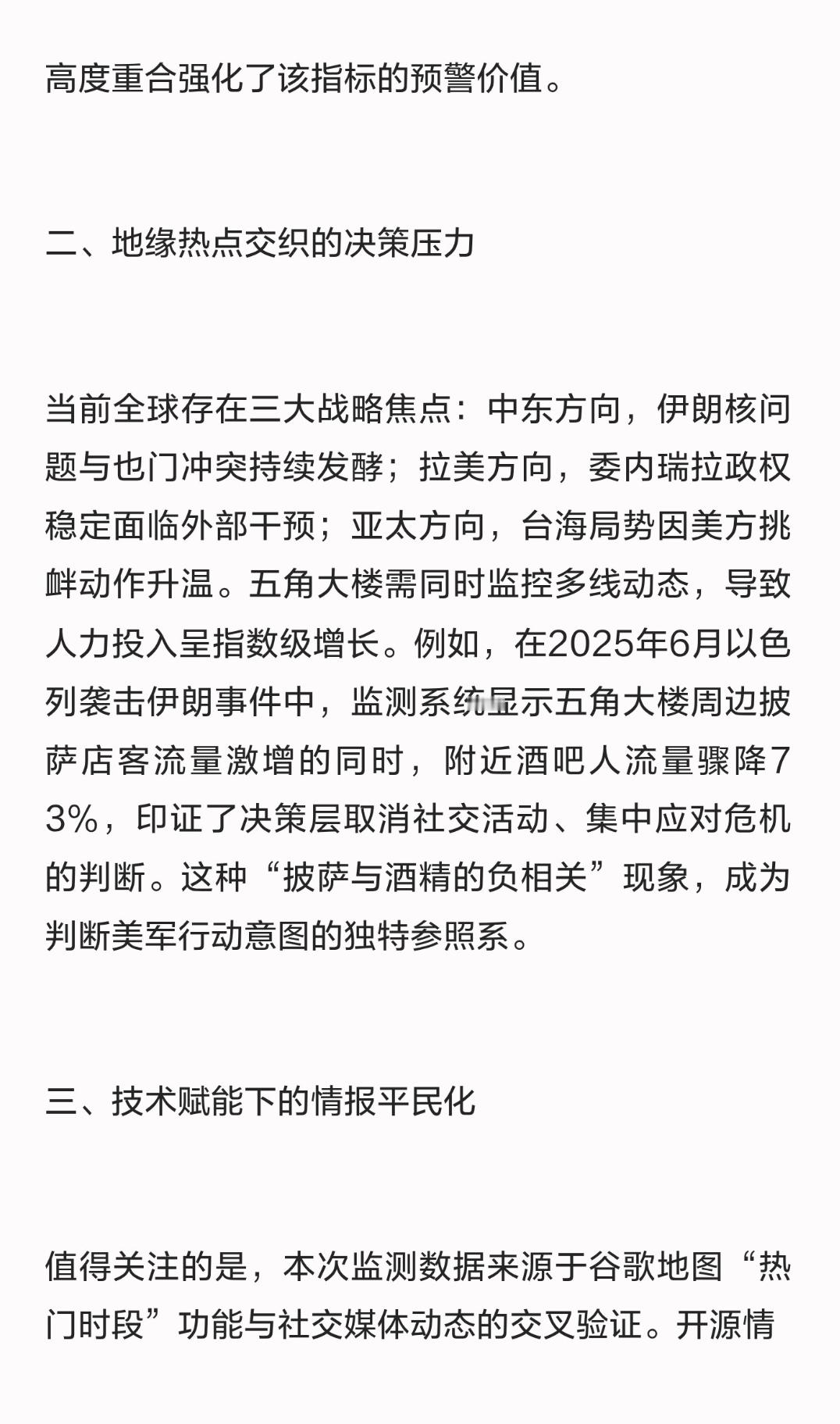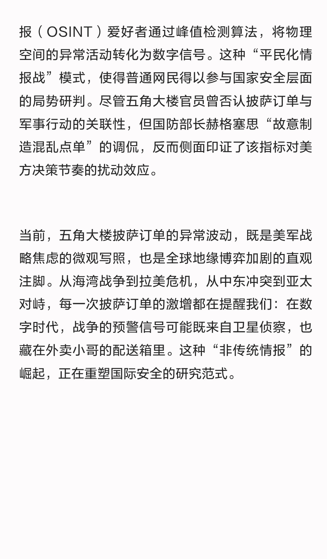 | 2026年1月3日,五角大楼附近披萨订单量异常攀升的现象引发全球关注。根据“五角大楼披萨指数”监测网站数据,周边达美乐、棒约翰等连锁店订单量较平日激增182%-208%,部分门店忙碌度突破200%,与此同时,美国国防部将战备等级提升至DEFCON 4级(高度戒备)。这一非官方开源情报指标的突然活跃,反应出当前国际局势的复杂性与敏感性。“披萨指数”并非民间臆想,其历史命中率令人瞩目:1990年海湾战争爆发前8小时,五角大楼周边披萨订单量翻番;2024年6月伊朗对以色列发动袭击前1小时,棒约翰门店出现订单峰值;2025年9月中国阅兵期间,五角大楼附近披萨消费量激增4倍。这些案例形成明确逻辑链:当美军进入高度战备状态时,决策层与情报人员需通宵达旦分析局势,导致外卖需求暴增。此次订单激增恰逢美国总统特朗普下令空袭委内瑞拉军事设施,时间节点的高度重合强化了该指标的预警价值。当前全球存在三大战略焦点:中东方向,伊朗核问题与也门冲突持续发酵;拉美方向,委内瑞拉政权稳定面临外部干预;亚太方向,台海局势因美方挑衅动作升温。五角大楼需同时监控多线动态,导致人力投入呈指数级增长。例如,在2025年6月以色列袭击伊朗事件中,监测系统显示五角大楼周边披萨店客流量激增的同时,附近酒吧人流量骤降73%,印证了决策层取消社交活动、集中应对危机的判断。这种“披萨与酒精的负相关”现象,成为判断美军行动意图的独特参照系。值得关注的是,本次监测数据来源于谷歌地图“热门时段”功能与社交媒体动态的交叉验证。开源情报(OSINT)爱好者通过峰值检测算法,将物理空间的异常活动转化为数字信号。这种“平民化情报战”模式,使得普通网民得以参与国家安全层面的局势研判。尽管五角大楼官员曾否认披萨订单与军事行动的关联性,但国防部长赫格塞思“故意制造混乱点单”的调侃,反而侧面印证了该指标对美方决策节奏的扰动效应。当前,五角大楼披萨订单的异常波动,既是美军战略焦虑的微观写照,也是全球地缘博弈加剧的直观注脚。从海湾战争到拉美危机,从中东冲突到亚太对峙,每一次披萨订单的激增都在提醒我们:在数字时代,战争的预警信号可能既来自卫星侦察,也藏在外卖小哥的配送箱里。这种“非传统情报”的崛起,正在重塑国际安全的研究范式。