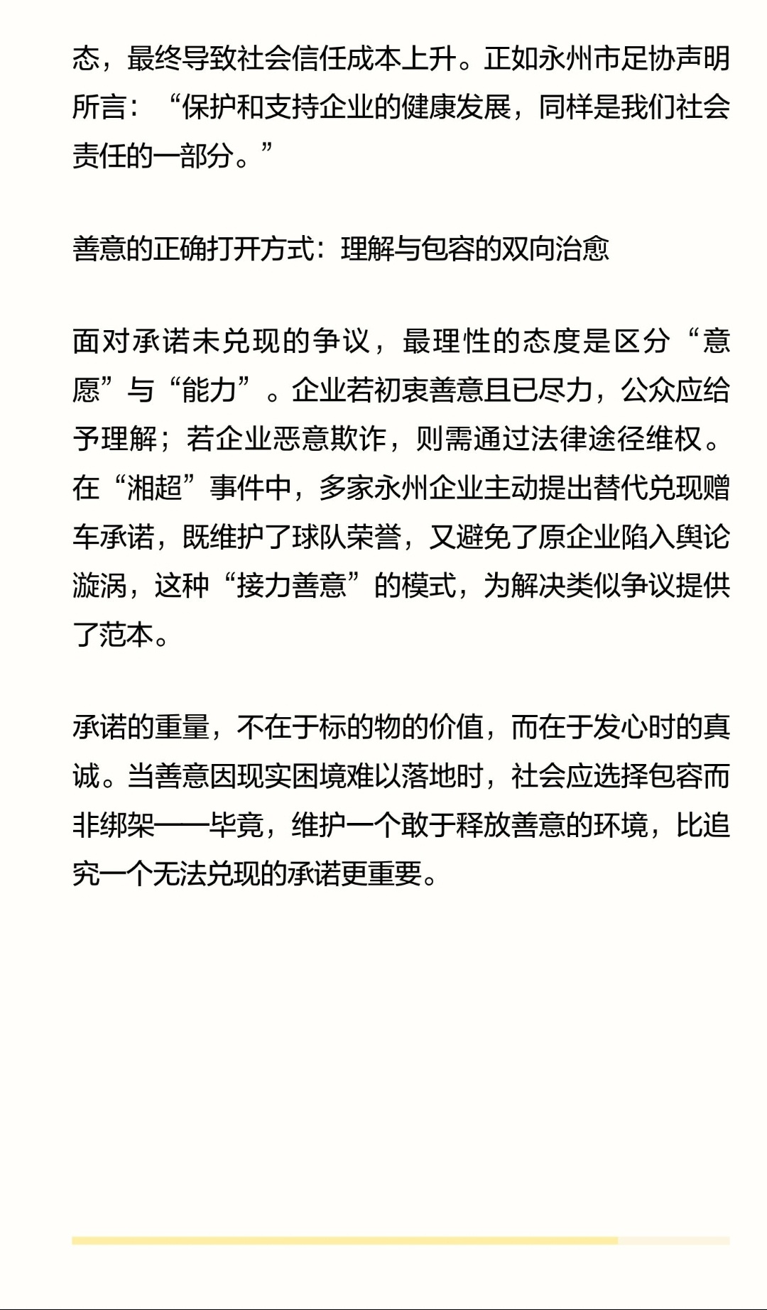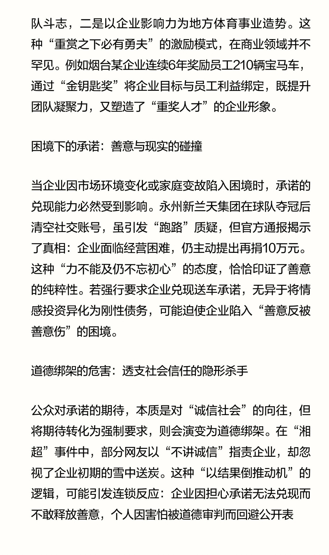 | 近日,“湘超”夺冠后企业承诺赠车未兑现引发的争议,将“承诺兑现”与“道德绑架”的边界推上风口浪尖。当企业因经营困境无法履行承诺时,公众是否应以“契约精神”为名强行追责?答案或许藏在“善意不应被换算成债务”的里。以“湘超”事件为例,永州新兰天集团董事长唐蕾在球队初创期赞助10万元,并在社交媒体承诺“夺冠送车”,其动机包含两层善意:一是通过物质奖励激发球队斗志,二是以企业影响力为地方体育事业造势。这种“重赏之下必有勇夫”的激励模式,在商业领域并不罕见。例如烟台某企业连续6年奖励员工210辆宝马车,通过“金钥匙奖”将企业目标与员工利益绑定,既提升团队凝聚力,又塑造了“重奖人才”的企业形象。当企业因市场环境变化或家庭变故陷入困境时,承诺的兑现能力必然受到影响。永州新兰天集团在球队夺冠后清空社交账号,虽引发“跑路”质疑,但官方通报揭示了真相:企业面临经营困难,仍主动提出再捐10万元。这种“力不能及仍不忘初心”的态度,恰恰印证了善意的纯粹性。若强行要求企业兑现送车承诺,无异于将情感投资异化为刚性债务,可能迫使企业陷入“善意反被善意伤”的困境。公众对承诺的期待,本质是对“诚信社会”的向往,但将期待转化为强制要求,则会演变为道德绑架。在“湘超”事件中,部分网友以“不讲诚信”指责企业,却忽视了企业初期的雪中送炭。这种“以结果倒推动机”的逻辑,可能引发连锁反应:企业因担心承诺无法兑现而不敢释放善意,个人因害怕被道德审判而回避公开表态,最终导致社会信任成本上升。正如永州市足协声明所言:“保护和支持企业的健康发展,同样是我们社会责任的一部分。”面对承诺未兑现的争议,最理性的态度是区分“意愿”与“能力”。企业若初衷善意且已尽力,公众应给予理解;若企业恶意欺诈,则需通过法律途径维权。在“湘超”事件中,多家永州企业主动提出替代兑现赠车承诺,既维护了球队荣誉,又避免了原企业陷入舆论漩涡,这种“接力善意”的模式,为解决类似争议提供了范本。承诺的重量,不在于标的物的价值,而在于发心时的真诚。当善意因现实困境难以落地时,社会应选择包容而非绑架——毕竟,维护一个敢于释放善意的环境,比追究一个无法兑现的承诺更重要。