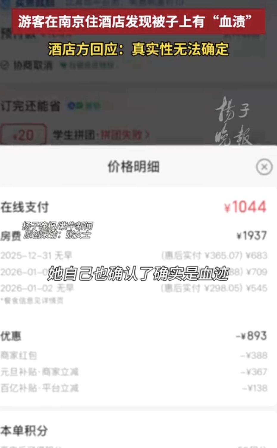 万万想不到! 宁波一对夫妻到南京去玩,结果在南京住酒店的第三天晚上居然发现被子上有“血渍”? 元旦期间,一位宁波来的女士和丈夫在南京一家酒店住了三天。 就在退房前一晚,她掀开被子准备休息,突然发现床单上好几片红褐色污渍,看着像血迹。 她立马心里发毛,这都住到第三天了,难道前两晚也睡在没换洗的床单上? 她马上联系前台,过了十分钟,来了个男员工,抱着团没叠整齐的被子来换,结果被子尺寸不对,像是单人被。 女士坚持要换合适的,工作人员才又去找了一床。 当晚值班经理来看过,承认污渍确实像血迹,说第二天会给处理方案。 结果等到退房,酒店都没主动联系。女士去前台问,对方反而呛她:“你是不是想索赔呀? 我们不是换过了吗?” 还强硬地说那不是血迹,可能是机油,甚至说她“咄咄逼人”。女士气得打了12345和订房平台投诉。 最后酒店给出的补偿方案,送一个南京鸭血粉丝汤礼盒。 女士明确拒绝,说她不要礼物,只想要一个诚恳道歉和合理处理。 但酒店经理后来说,客人是住了两天才反馈,“真实性无法确定”,还提到酒店床品是“三天一换”,并暗示客人曾要求“免一赔一”(免一天房费再赔一天),酒店无法接受。 对于此事,你们怎么看?