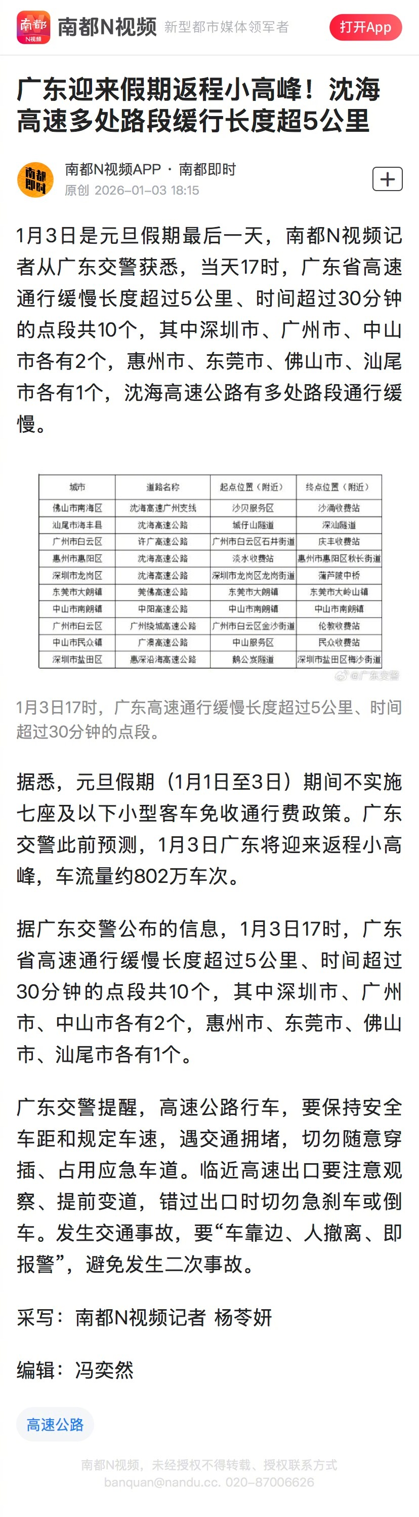 #广东元旦返程高峰#【广东迎来假期返程小高峰!沈海高速多处路段缓行长度超5公里】#沈海高速多地缓行超5公里#1月3日是元旦假期最后一天,南都N视频记者从广东交警获悉,当天17时,广东省高速通行缓慢长度超过5公里、时间超过30分钟的点段共10个,其中深圳市、广州市、中山市各有2个,惠州市、东莞市、佛山市、汕尾市各有1个,沈海高速公路有多处路段通行缓慢。南都N视频记者 杨苓妍广东迎来假期返程小高峰!沈海高速多处路段缓行长度超5公里