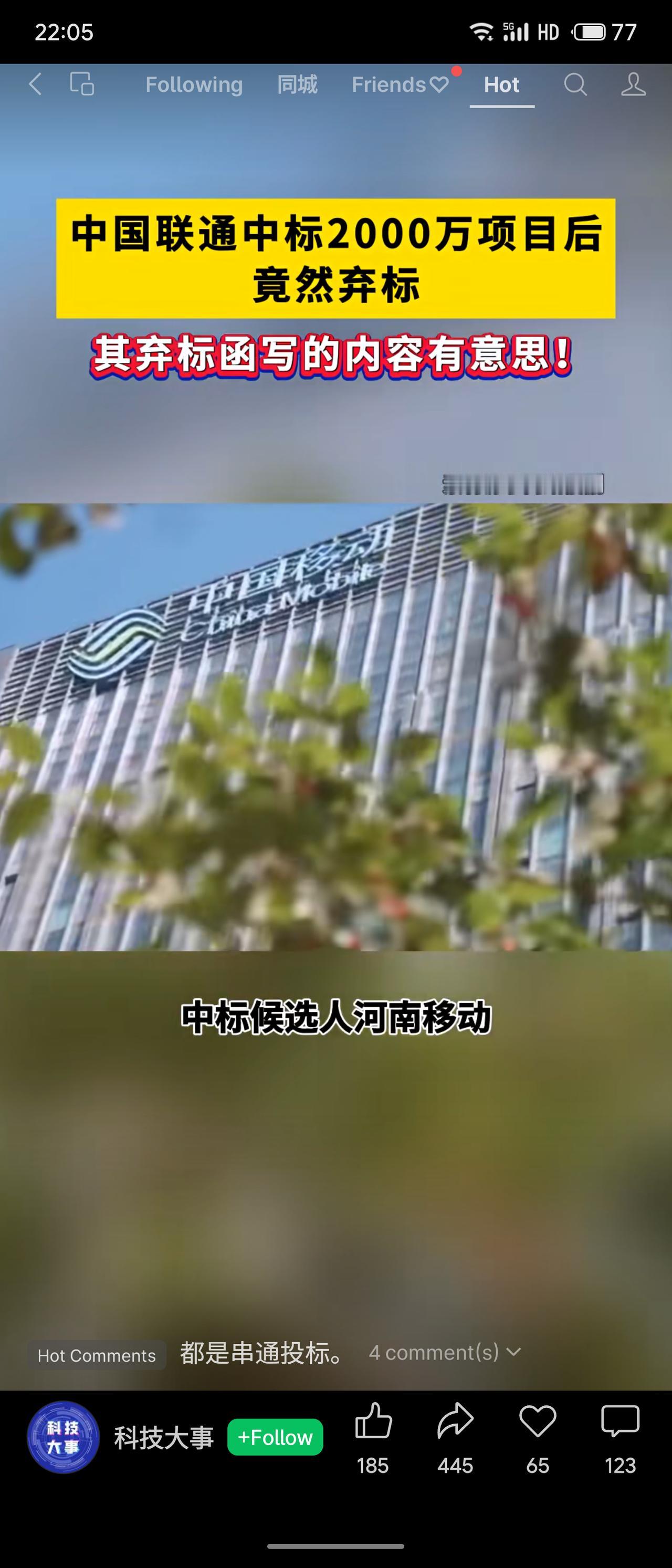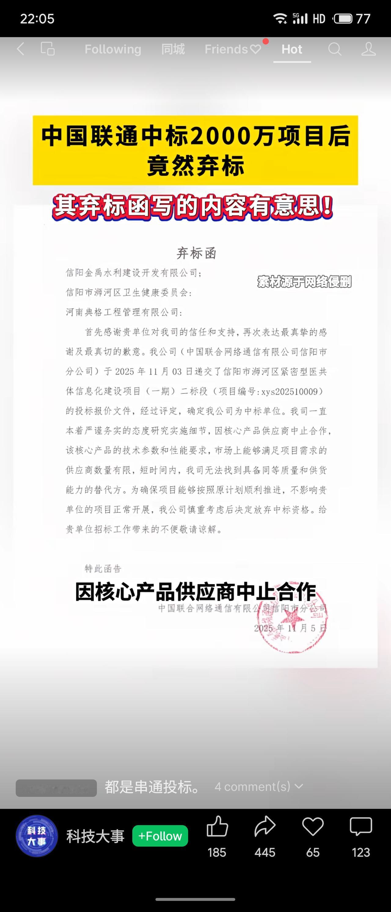 中国联通在河南信阳中标2476万元的医共体信息化项目后,随即发函弃标。弃标理由为核心产品供应商中止合作,且短期内无法找到同等质量的替代方。随即由排名第二的河南移动拿下项目。