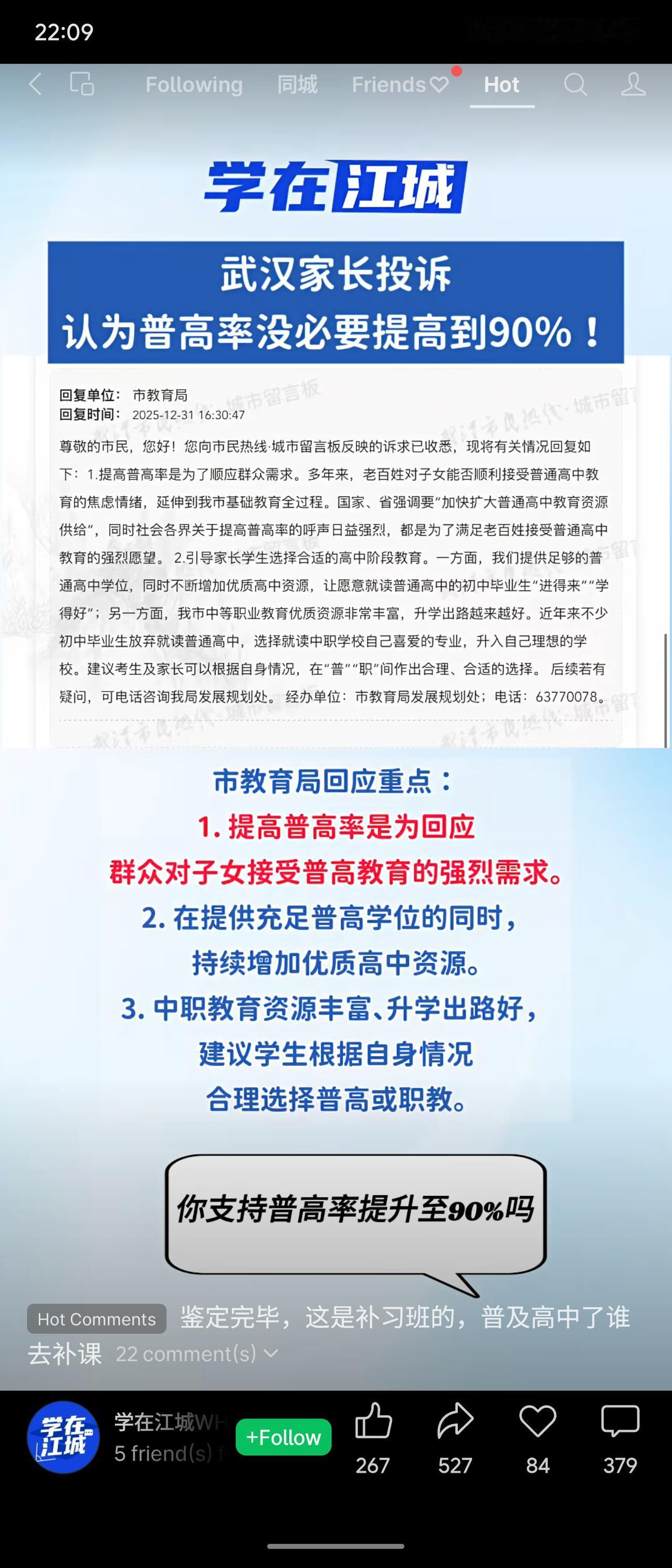 针对将普高率提至90%的争议,武汉家长认为应适度提升、重点加强职校质量,并建议恢复留级制。市教育局回应称,提高普高率是为满足群众接受普通高中教育的强烈需求,同时将保障充足学位并持续优化优质中职教育资源,引导学生根据自身情况合理选择。