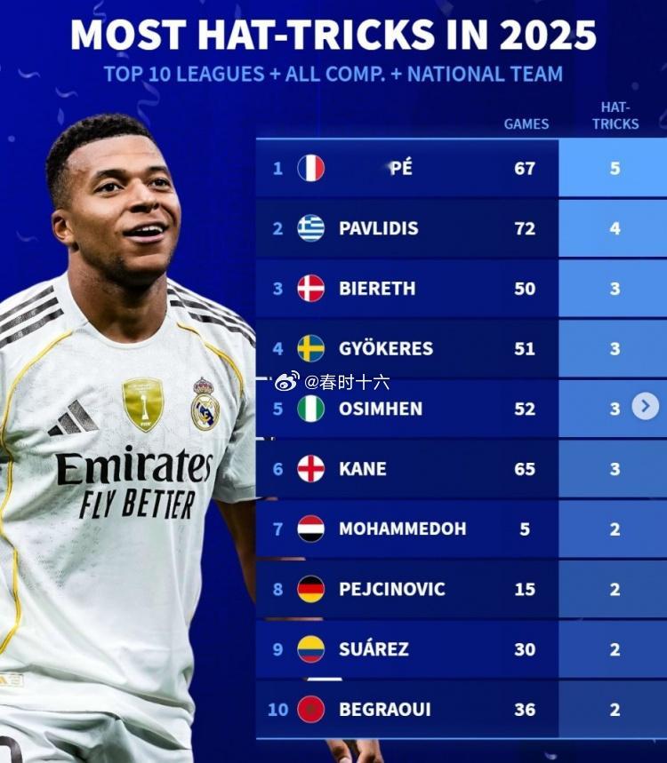 2025年俱乐部+国家队各项赛事双响+戴帽次数榜:姆巴佩均位居首位 1月3日讯 2025年已经过去,《转会市场》也统计了2025年前十联赛球员的俱乐部+国家队各项赛事双响次数和戴帽次数,姆巴佩同时领跑双榜。2025年各项赛事双响次数榜:1. 姆巴佩,67场,17次2. 凯恩,65场,15次3. 哈兰德,55场,14次4. 奥斯梅恩,52场,12次5. 登贝莱,51场,8次6. 约克雷斯,51场,8次7. 帕夫利季斯,72场,8次8. 拉菲尼亚,51场,7次9. 莱万多夫斯基,53场,7次10. 吉拉西,58场,7次2025年各项赛事戴帽次数榜:1. 姆巴佩,67场,5次2. 帕夫利季斯,72场,4次3. 比雷斯,50场,3次4. 约克雷斯,51场,3次5. 奥斯梅恩,52场,3次6. 凯恩,65场,3次7. 莫哈默德,5场,2次8. 佩伊契诺维奇,15场,2次9. 路易斯·哈维尔·苏亚雷斯,30场,2次10. 贝格拉欧,36场,2次