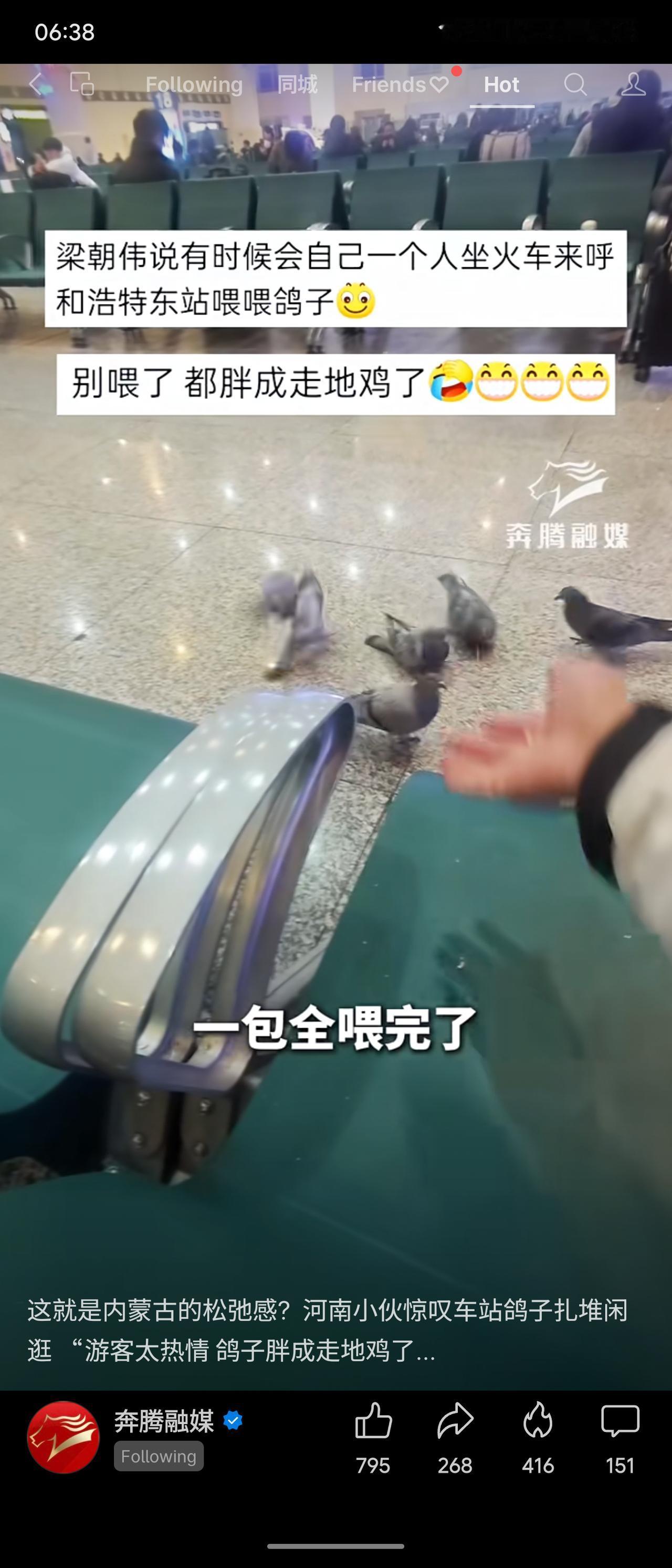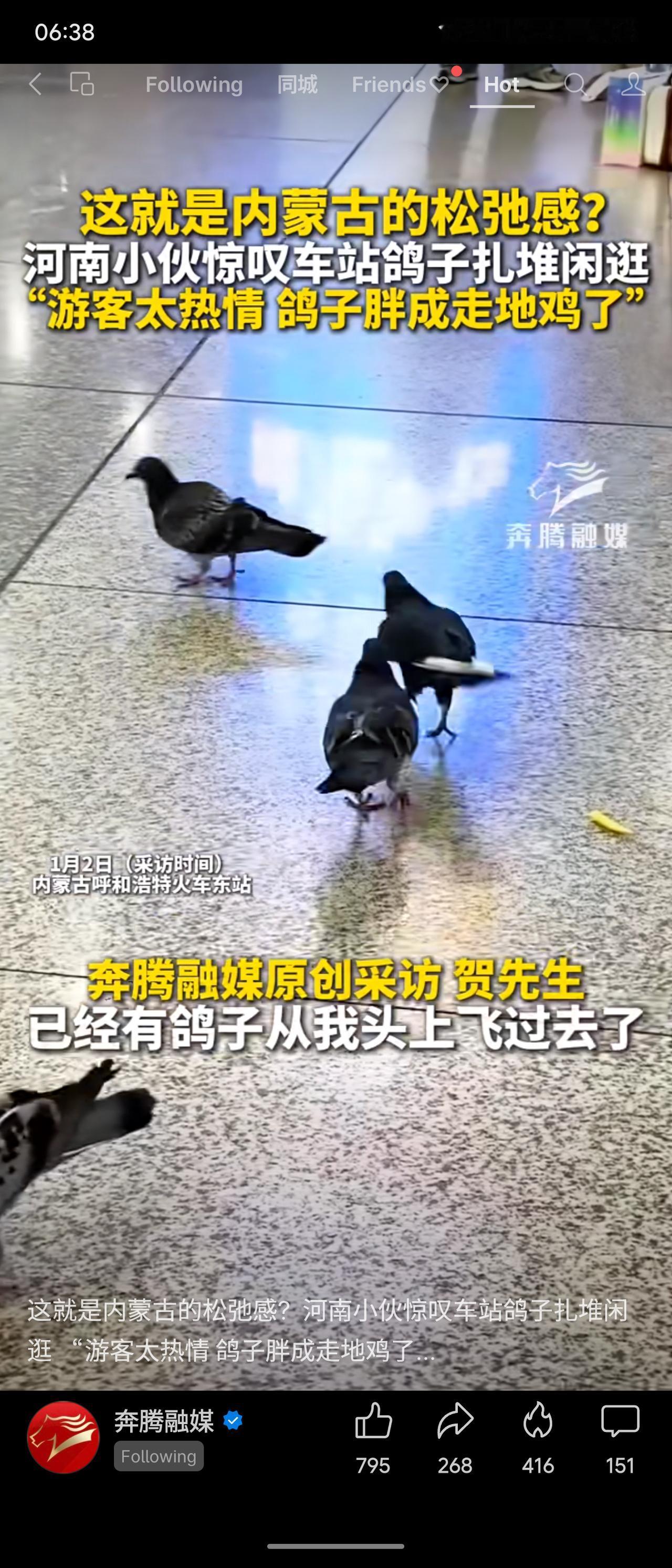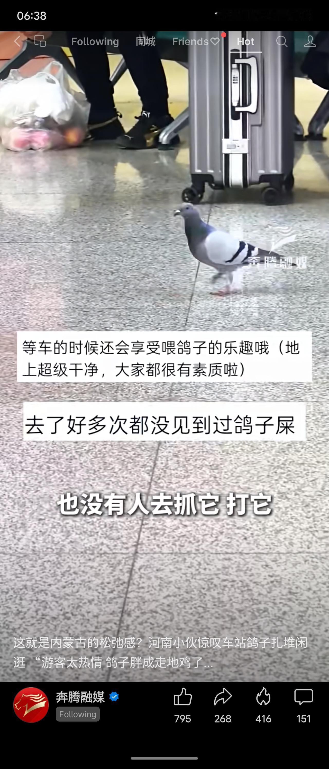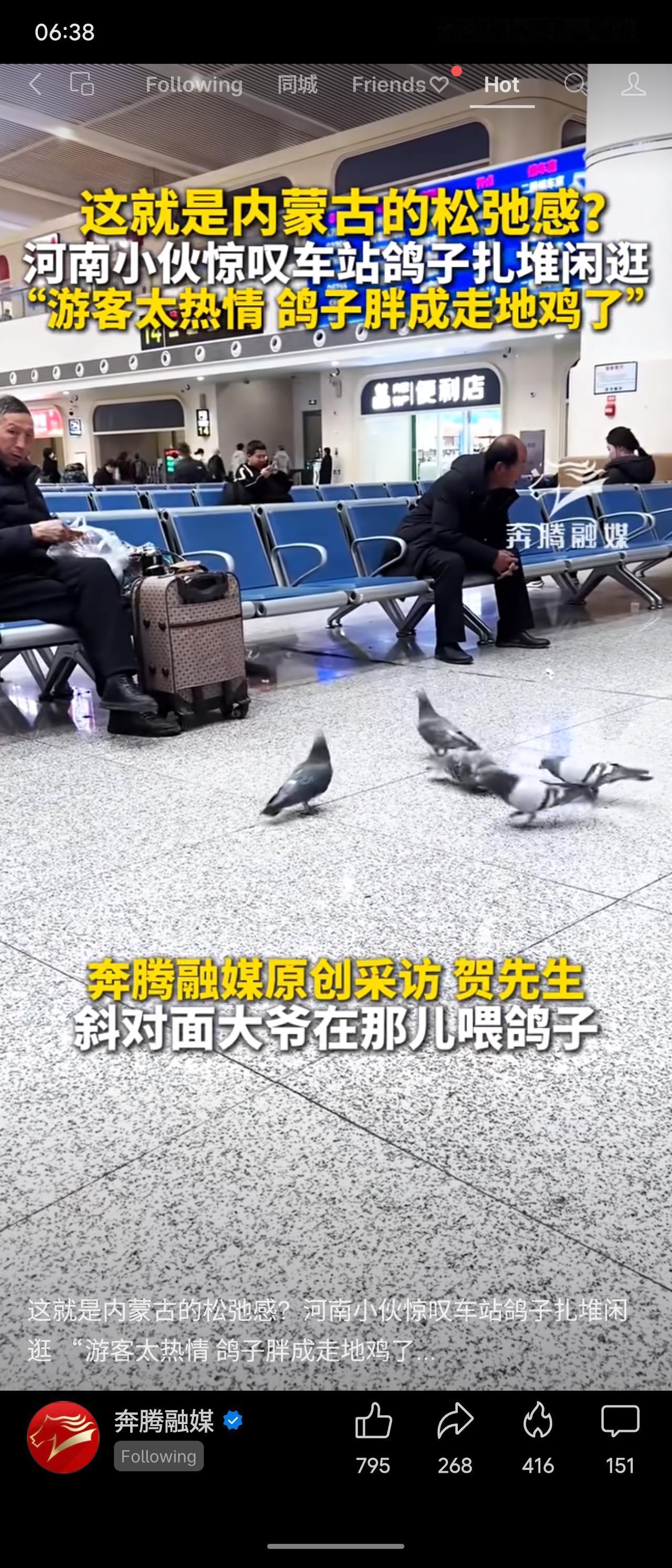 在内蒙古呼和浩特火车东站,成群鸽子悠闲漫步,与旅客和谐共处。因游客热情投喂,它们体型丰腴如“走地鸡”。候车区地面干净,无人惊扰,展现了一种特有的从容、友好氛围。