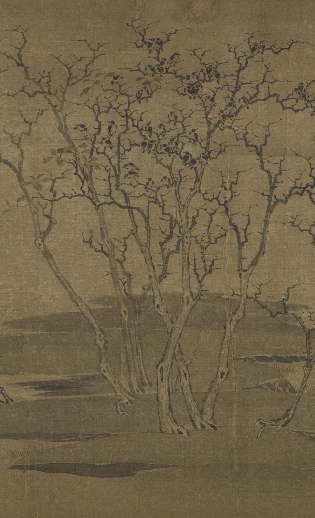 现实版“枯木寒鸦图”与赵伯驹《老树寒鸦图》。现实版,拍摄于小区楼下。 《老树寒鸦图》传为南宋赵伯驹所作的绢本设色画,现藏于弗利尔美术馆。画面里,近处滩涂的老树枝干扭曲、树叶凋零,寒鸦姿态各异,远处山色如黛,山脚竹林房屋隐现,意境宁静深远。画家笔触细腻,构图巧妙,把季节更迭与生命循环展现得淋漓尽致,近景写实,动静结合,让画面生动有趣。不过这作品也有争议,款与印俱伪,有人认为“云孚修制”之人才是真正作者。