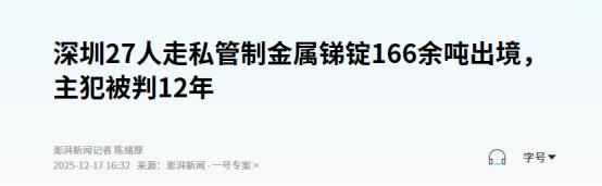 罚款百万判刑!2025年12月16日,一起重大走私案被公开宣判!中国不再忍气吞声,锑管控看其稀土,美国睡不着了! 2025年的时候,我国针对军民两用物项实施了严格的出口管控。除了稀土资源管控极其严格之外,关于锑出口管控也是非常的严格。就在2025年的时候,我国成功破获了一起关于锑出口走私的案件,并且对此进行了公开宣判。 2025年12月26日的时候,深圳中院公开宣判了27人实施的六起走私锑锭系列案。这起案件的26人均因各自走私数量和地位作用等,判处了12年等不同年份的有期徒刑。除了判处有期徒刑之外,更是对其中一人判处罚金100万。 此事立即成为国际关注焦点,在我国三令五申严格管控军民两用物项出口的前提下,他们仍旧与境外走私团伙合谋去走私。这种行为在严重的影响我国的核心利益,并对我国的永远造成了直接的打击。 虽然储量位于全球第一,但我国的锑储量并不是特别多。仅有64万吨左右,占据全球30%左右。 如果高强度的去进行开采,就会对我国的战略储备造成直接的影响。所以出于内需考虑,再加上一些其他因素影响,我国才会严重对其实施出口管控。 作为中华儿女,在无法为祖国做贡献的前提下。应该严格遵守国家发布的各项禁令,去以一己之力维护国家的利益。这起案件给每一位朋友发出了警告,不要为了一己私利而犯下糊涂事。 对此,您怎么看?欢迎评论区留言您的看法,我们一起讨论一下。 (信息来源:深圳27人走私管制金属锑锭166余吨出境,主犯被判12年-澎湃新闻)