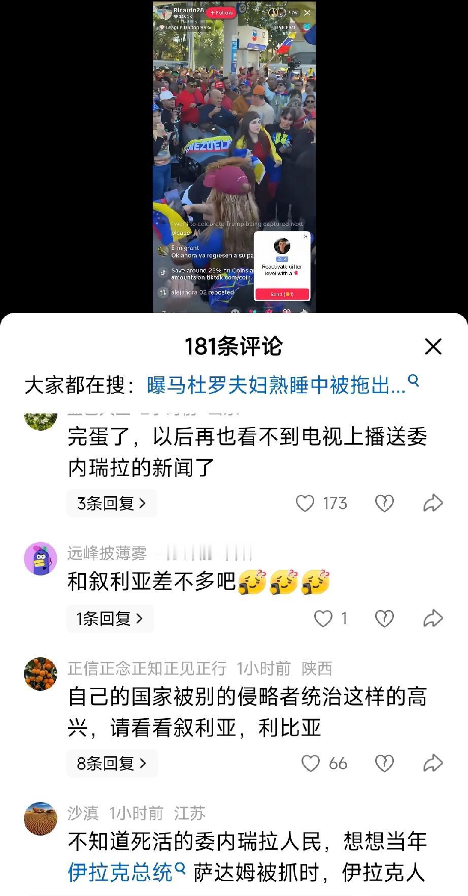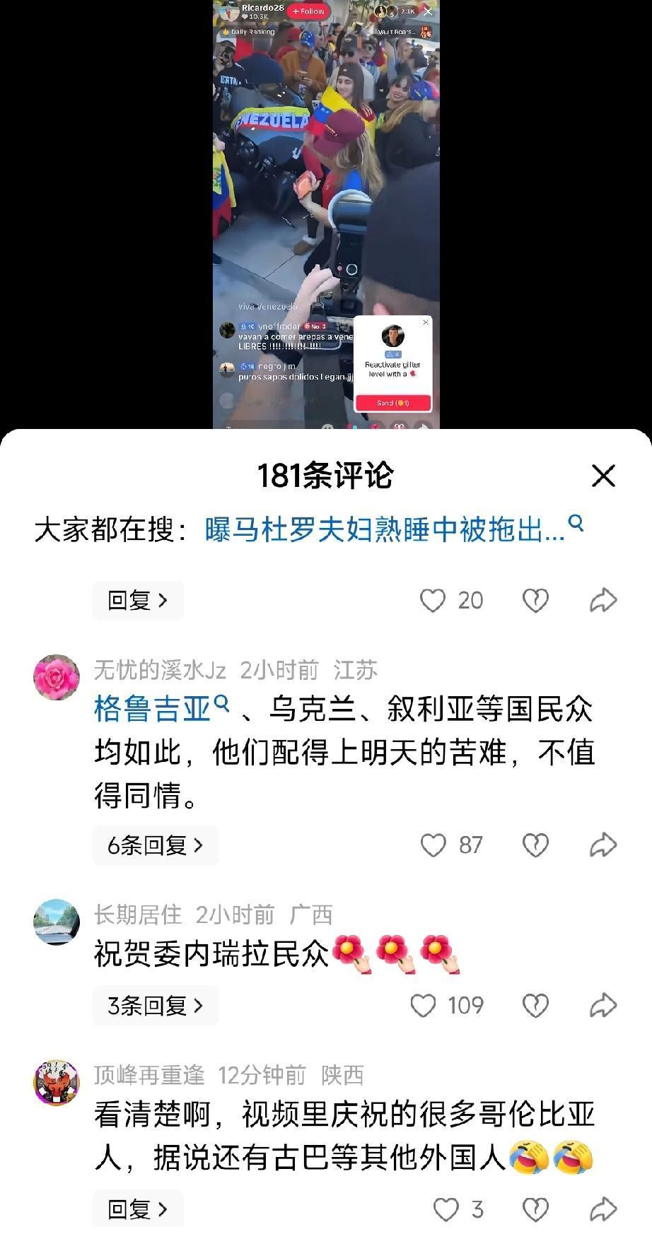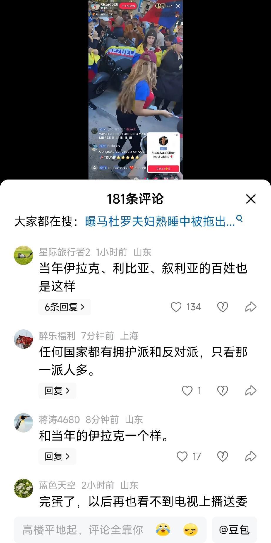 马杜罗被抓以后,现场街头直播委内瑞拉民众的心情,民众手拿国旗,载歌载舞。 评论区这样说:我想起伊拉克当年就是这样,萨达姆被抓住了,高兴的要死,现在跳舞的人都死不见尸首了。 自己的国家被别的侵略者统治这样高兴,看看叙利亚人民吧。 仿佛叙利亚巴沙尔倒台一幕又重现了,可以想象委内瑞拉用不了多久就可以重蹈叙利亚的乱象。 不知死活的委内瑞拉人民,想想当年伊拉克萨达姆被抓时,伊拉克人也是载歌载舞,现在看看伊拉克人过的什么可怜的日子。 乌克兰,叙利亚的民众都如此,他们配得上明天的苦难,不值得同情。 我想问一下这伊拉克叙利亚人民现在过得怎么样了?还有委内瑞拉民众怎么了?为什么很多龙国人这么恨他们?