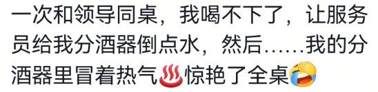 一次和领导同桌,我喝不下了,让服务员给我分酒器倒点水,然后......我的分酒器里冒着热气,惊艳了全桌