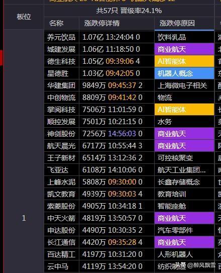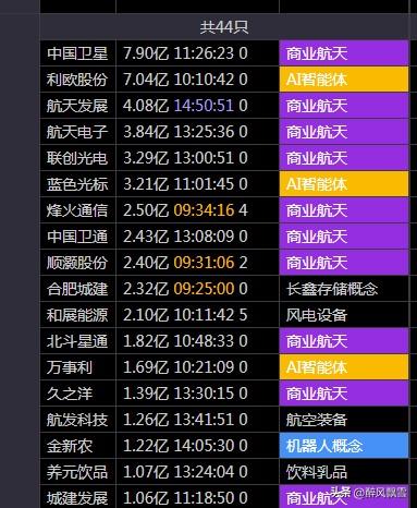 概念梯队寻找市场主线(1月4日) 主线有相对持续性,板块效应强,相对好操作!市场主线判定:商业航天为绝对主线从连板梯队的题材分布、资金体量、标的数量三个核心维度,能明确商业航天是当前市场主线,AI智能体、机器人概念为辅助支线。 第一、核心判定依据 1. 标的数量占比最高 商业航天题材标的在板位1、板位4、板位5/6及独立梯队中均有密集分布,覆盖中天火箭、长江通信、城建发展、神剑股份、航天晨光、中国卫星、航天发展、航天电子、联创光电、宏英智能、雷科防务、五洲新春、大业股份等数十只标的,远多于AI智能体、机器人概念的标的数量。 2. 资金布局力度最大 1)、大资金标的:中国卫星(7.90亿)、航天发展(4.08亿)、航天电子(3.84亿)等头部标的资金规模远超其他题材; 2)、中小资金标的:中天火箭(4819万)、长江通信(4420万)等低位标的也获持续资金关注,形成“高低位联动”的资金布局结构。 3. 梯队完整性最强 商业航天题材覆盖板位1(低位)到板位6(高位)的全连板梯队,从低位首板到高位晋级板均有标的承接,而AI智能体、机器人概念仅在部分板位零散分布,缺乏完整的梯队传导。 第二、支线题材定位 1. AI智能体:为次要支线,有利欧股份、蓝色光标、德生科技等标的,但资金集中度和标的数量远不及商业航天,仅在部分板位形成局部热点。 2. 机器人概念:为弱支线,标的(星德胜、金新农、泰尔股份同时有商业航天概念)少且资金规模中等,仅作为市场轮动补涨方向。 本人仅为找市场主线,文中个股不作为投资依据!