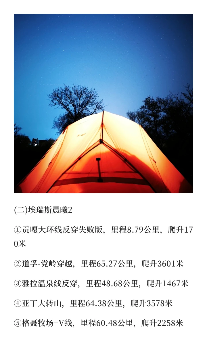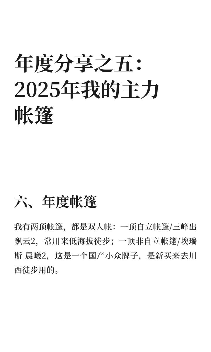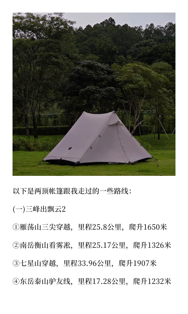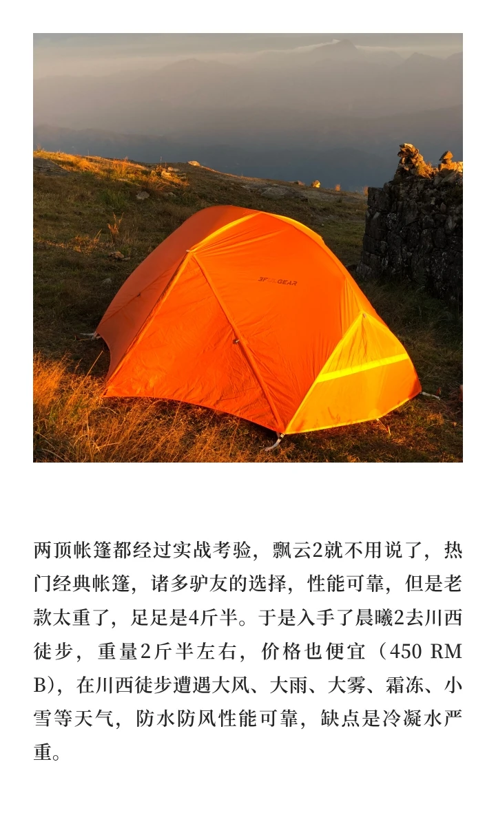 两顶帐篷都经过实战考验,飘云2就不用说了,热门经典帐篷,诸多驴友的选择,性能可靠,但是老款太重了,足足是4斤半。于是入手了晨曦2去川西徒步,重量2斤半左右,价格也便宜(450 RMB),在川西徒步遭遇大风、大雨、大雾、霜冻、小雪等天气,防水防风性能可靠,缺点是冷凝水严重。(详见开帐测试和深度体验笔记)