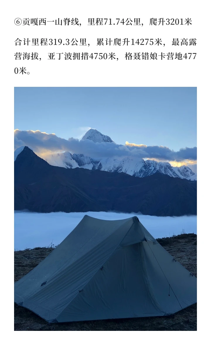合计里程319.3公里,累计爬升14275米,最高露营海拔,亚丁波拥措4750米,格聂错娘卡营地4770米。