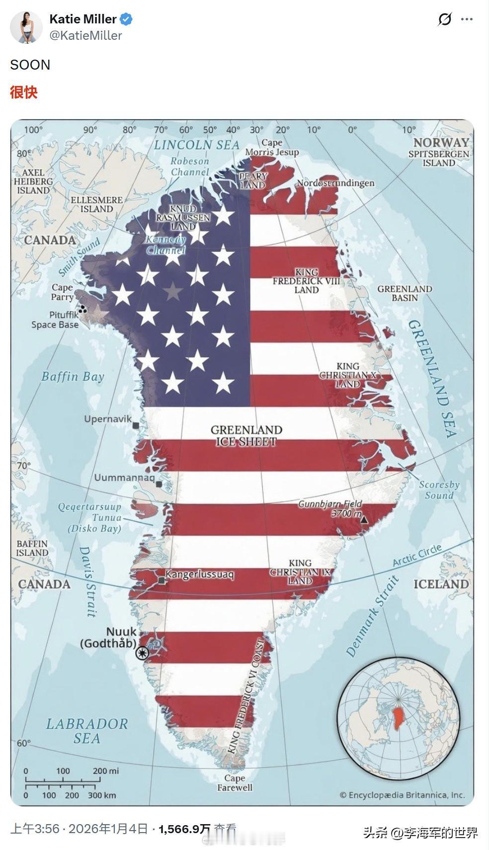 美国高官夫人公开“暗示”格陵兰岛是美国的下一个目标。 白宫副幕僚长斯蒂芬·米勒的夫人凯蒂·米勒在X上发了一张格陵兰岛全境被美国星条旗完全覆盖的图片,并配文 “SOON”(很快)。 美国看来这是要趁热打铁,借着拿下委内瑞拉的时机,再拿下格陵兰岛。 相比委内瑞拉,拿下格陵兰岛显然要容易的多,因为格陵兰岛唯一的驻军就是美军。 如果说之前还会以为老特只是口嗨表演,现在应该没有人会怀疑老特是口嗨了。 他是真敢这么做。 你别说,我还真期待老特这么做,拿下格陵兰,然后加拿大,再然后墨西哥,哥伦比亚……[奸笑] 好期待有这么一天[狗头]