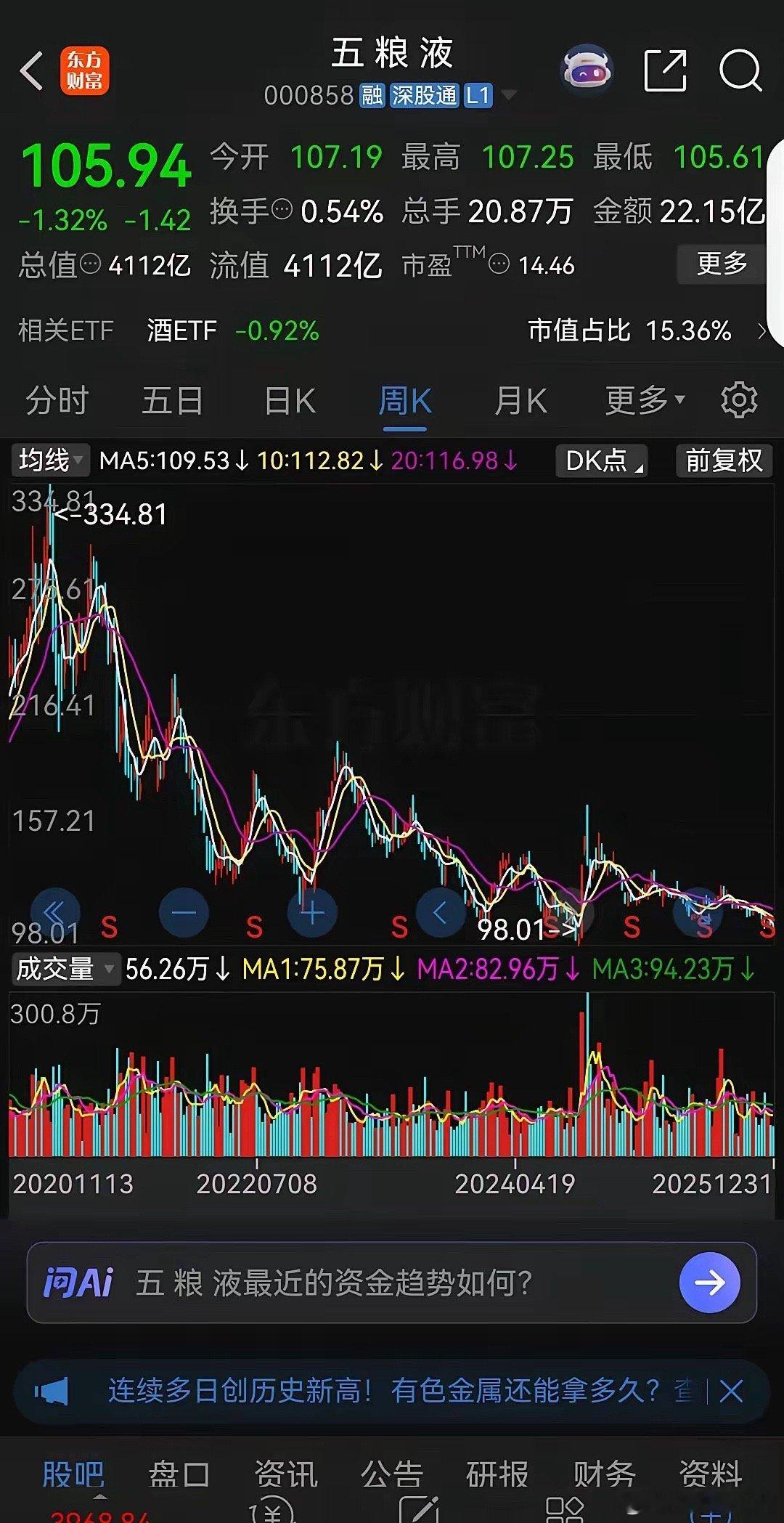 五粮液从2021年的334.81元跌到如今的105.94元,跌幅高达68%。不少股民认为现在是抄底的绝佳机会。事实真正如此吗?我看未必!2014年,上一次牛市前,五粮液只有14块多钱,到2021年的时候最高涨到了357.19元,7年的时候暴涨了25倍。如今虽然下跌了68%,仍然较2014年时的价格大涨了7倍左右,仍然在半山腰。另外,白酒之所以大跌,有以下几个原因:1、消费需求大幅萎缩。2、产能过剩,供需失衡与库存高企形成恶性循环。3、高端白酒投资泡沫被刺破,涨价预期消失,投资需求大幅萎缩。4、渠道变革冲击传统体系,自媒体以及电商平台的大额补贴,打破了传统经销商的加价模式,让白酒价格更透明。5、消费群体逐渐萎缩,年轻人普遍不喝白酒,中老年人也注重健康,喝的越来越少。曾经风光无限的万科都已经没落了,这说明没有任何一个行业可以一直繁荣下去,总有走到尽头的时候。另外现在大牛市行情下,白酒都不涨,你还指望着熊市来了它再涨?都醒醒吧,市场永远是对的!