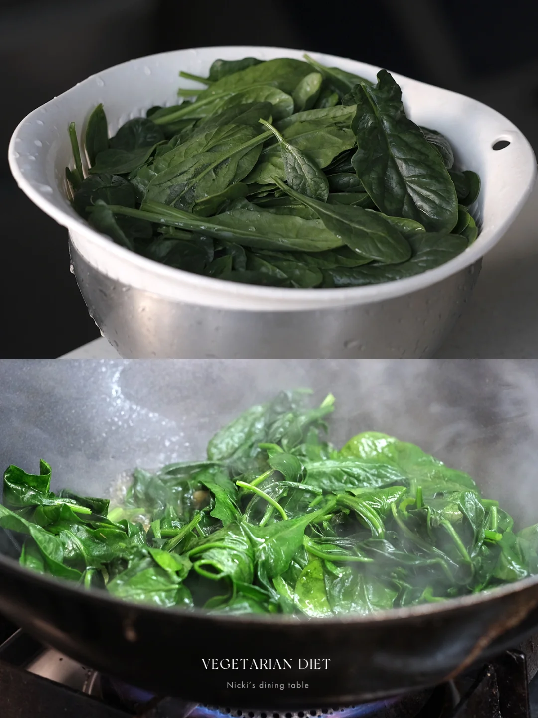 •锅中再倒入油,放入大蒜炒香后,加入菠菜,加少许盐炒断生后关火,倒入炒过的苹果粒拌匀后盛出。