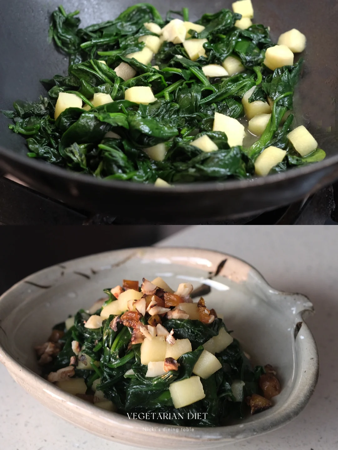 苹果拌菠菜,作为沙拉很常出现,但两者都炒过之后的结合不知道你们有没有试过?听着也许会奇怪,但苹果炒过之后,甜度更加明显,加上果干与坚果后,口感更加丰富,变身一道妥妥的下饭菜……