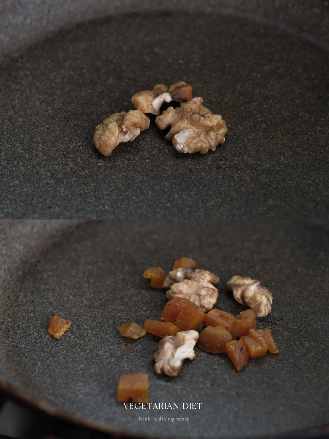 •杏干切丁(可以用蔓越莓干或葡萄干代替),核桃和杏干放入平底锅中小火烘烤一下,取出,核桃切碎