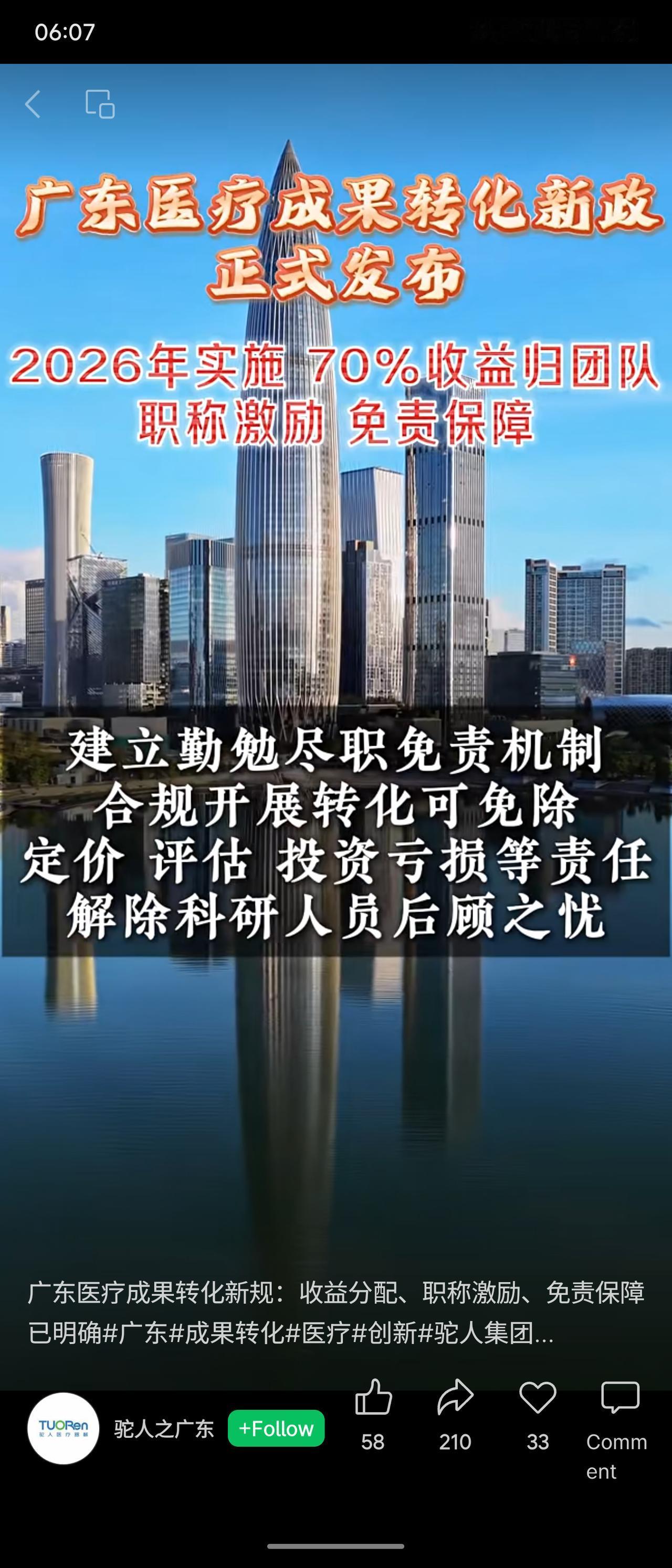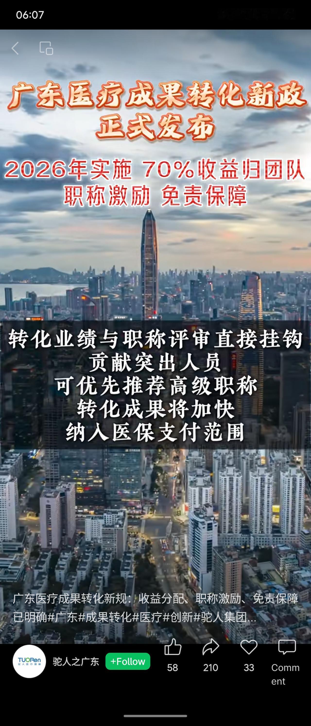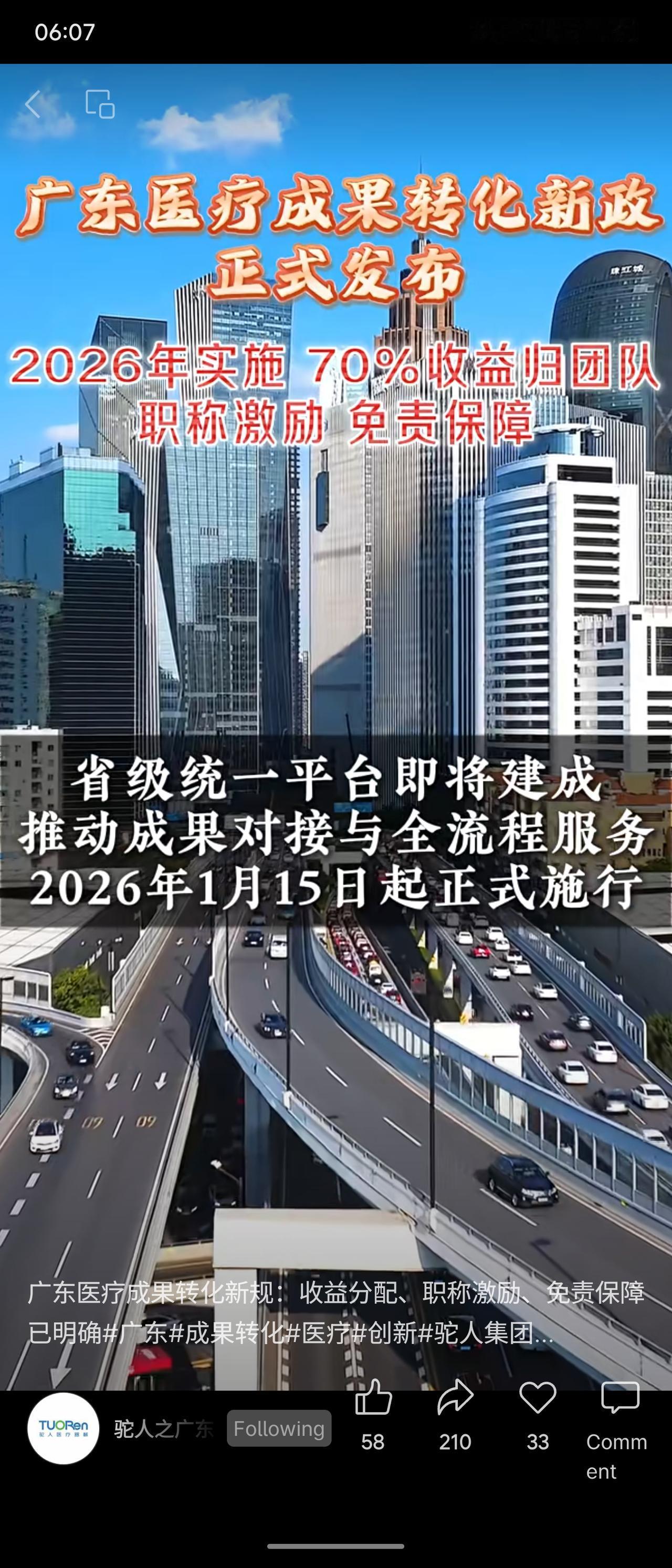广东省将于2026年实施医疗科技成果转化新政。核心内容包括:不低于70%的转化净收入奖励科研团队;建立免责机制,合规转化可免于追究相关责任;转化业绩与职称评审直接挂钩;省级统一平台将提供全流程服务,推动成果对接并加快纳入医保支付范围。