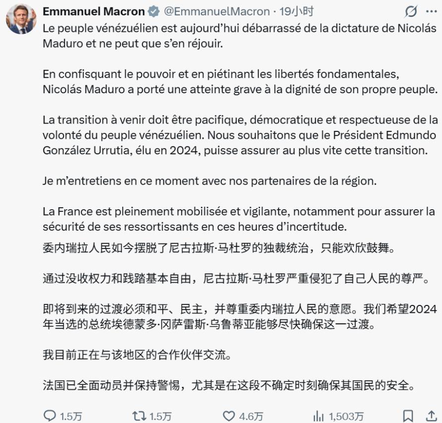 针对委内瑞拉“变天”,马克龙连接连发文回应,态度耐人寻味!1月4日,法国总统马克龙先是越洋点赞反对派领袖科里纳,紧接着又慷慨激昂地宣布委内瑞拉人“摆脱了独裁”,甚至直接拍板支持冈萨雷斯接管权力。 特朗普宣布美国要无限期“管理”委内瑞拉,直到完成所谓的“安全权力过渡”,甚至明说要让美国石油公司进入委内瑞拉接管能源产业。 就在这阵混乱中,马克龙在1月4日接连发文回应,要知道,当时不少国家都在谴责美国的军事干预,认为这违反了联合国宪章,就连美国国内都有议员反对这场冒险行动。 可马克龙偏偏反其道而行之,不仅点赞反对派领袖,还给美国主导的政权更迭站台。 说白了,这个态度里的政治考量很明显,法国在拉美一直有不少利益牵扯,尤其是能源领域,委内瑞拉作为全球最大的产油国之一,一旦局势稳定,不管是哪个政权上台,能源合作都是绕不开的话题。 马克龙现在提前站队,就是想抢在前面,为后续的利益布局铺路。 不过马克龙的算盘能不能打响,还很难说,现在委内瑞拉的局势根本没明朗,副总统罗德里格斯已经明确表态,马杜罗才是唯一合法总统,还要求美国立即放人,委内瑞拉绝不会沦为殖民地。 而且反对派内部也不是一条心,特朗普都已经排除了科里纳的领导资格,说她缺乏国内支持,美方更倾向于让自己人先过渡管理,马克龙这会儿支持冈萨雷斯,大概率是一厢情愿。 接下来的局势走向,关键还得看委内瑞拉军方的态度,以及国际社会的反应,联合国安理会已经确定要就美国的军事行动召开紧急会议,后续的讨论结果可能会影响局势走向。 而马克龙这波急着表态的操作,到底是能为法国争取到利益,还是会让法国陷入被动,只能再接着观察了。 毕竟在国际事务里,抢跑不一定就能赢,尤其是这种涉及他国主权的事儿,太急着站队很容易翻车。